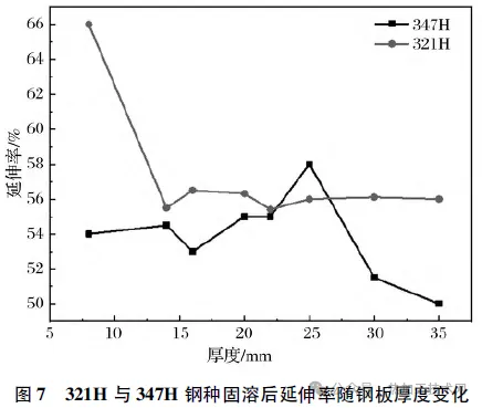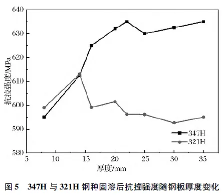 (1)321H钢种固溶后在晶界位置与晶内均析出较大的第二相颗粒;347H钢种固溶后第二相组织溶解较为充分,仅存在一些细小的第二相弥散分布于基体中,固溶效果优于321H钢种。 (2)347H与321H钢种固溶处理后均存在不同形式的“混晶”,347H“混晶”后形成明显细晶层与粗晶层累积堆叠现象。 (3)在不同厚度规格下,347H钢种展现出良好的屈服强度与抗拉强度,321H钢种延伸率未随厚度变化而变化,表现出良好的稳定性。