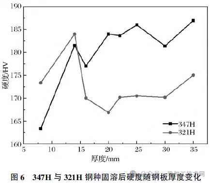 2.1 显微形貌与第二相形态 对347H与321H钢种固溶后表面显微形貌如图2所示。由图2可知,固溶后两种材料基体中均有第二相析出。347H样品晶界位置析出较大的颗粒状析出物,在其晶粒中有弥散分布的第二相存在,晶界处有利于第二相形核及长大,且该位置第二相颗粒易在变形过程中产生应力集中,从而致使裂纹萌生;同时通过对晶界处第二相颗粒进行能谱分析发现,主要由Fe-Nb-Cr-Ni构成的金属间化合物,析出后使得周围组织中产生贫铬、贫铌区域,对材料抗腐蚀性和高温性能带来负面影响。弥散分布于晶内的第二相可有效阻碍位错运动,形成第二相强化,进一步提升材料强度。321H第二相析出物明显较347H 析出物聚集且具有更大的几何尺寸。通过EDS能谱分析发现第二相主要为Fe-Cr-Ti-Ni化合物。 321H与347H两种材料基体相和析出第二相能谱分析见表2。由表2可知,析出第二相对于Cr、Ni、Ti、Nb等合金元素的聚集作用非常显著。尤其在347H钢种中,第二相中Nb达到26.5%,而其周围基体中Nb仅占5.6%,同时,由于Nb与C形成化合物的能力强于Cr,因此在347H基体中Cr含量呈较高水平,第二相周围未形成贫铬区,对347H钢种耐晶间腐蚀性能有较大帮助。 2.2 金相组织形貌 347H与321H钢种固溶后金相组织如图3所示。由图3可知,347H钢种固溶后有明显的“混晶”现象,且“混晶”为细晶层与粗晶层相互堆叠形成,每层间距约100μm。形成这一现象的原因在于固溶过程中,晶界位置析出相重新溶解于基体中,但由于Nb扩散能力较差,无法均匀扩散至整个晶粒,因此保温过程中,Ni 含量较少区域晶粒长大粗化,而富铌区域则形成细小的再结晶组织。321H钢种固溶后同样存在“混晶”现象,但与347H钢种不同,其“混晶”仅由个别粗大晶粒形成,其余组织多为细小的退火孪晶组织。 2.3 力学性能对比 347H与321H钢种固溶后不同厚度规格屈服强度如图4所示。由图4可知,随着钢板厚度增加,两种材料屈服强度均呈现下降趋势。其中321H钢种屈服强度下降趋势明显,当钢板厚度为14mm时屈服强度曲线达到峰值277MPa,之后则随厚度增长至35mm,屈服强度下降至217MPa,最大差值达到60MPa。347H钢种屈服强度随厚度增加同样呈下降趋势,但下降幅度较321H钢种明显减弱,其最大值为22mm厚度时达到256MPa,当钢板厚度达到30mm时,屈服强度降低至236MPa。通过两条曲线对比发现,随着钢板厚度的增加,屈服强度均呈下降趋势,但347H钢种下降趋势明显弱于321H,同时当厚度达到16mm以上时,321H钢种屈服强度低于347H钢种。 347H与321H钢种固溶后抗拉强度随厚度变化曲线如图5所示。由图5可知,321H钢种固溶后抗拉强度随钢板厚度增加变化趋势与屈服强度一致,在样品为14mm厚度时达到抗拉强度最大值613MPa,并在其后抗拉强度随厚度增加逐渐降低,在30mm厚度时达到最低点仅为592MPa。347H钢种固溶后抗拉强度随厚度增加而增加,厚度为8mm时抗拉强度值为595MPa,当厚度增加至35mm时,抗拉强度达到635MPa。 321H与347H钢种固溶后硬度随钢板厚度的变化规律如图6所示。由图6可知,321H钢种在14mm厚度样品时,硬度达到一个高点184HV,之后随厚度的增加硬度反而下降,在样品厚度为20mm时降到最低值166HV,其后硬度随厚度的增加而增加,在35mm时达到175HV。347H钢种在样品厚度为14mm时同样硬度达到181HV的较高值,并在16、30mm两次小幅下降后,在35mm 时达到187HV的高点。在不同厚度规格条件下,347H钢种强度、硬度优于321H钢种,一方面是由于两钢种成分差异,Nb添加后固溶到奥氏体基体中引起晶格畸变大于Ti 作用,同时347H Nb 添加量为0.5%,添加量大于321H,因此体现在力学性能上使得347H强度优于321H。另一方面,固溶后347H钢种固溶效果较好,形成细晶与粗晶分层堆叠的金相组织,其中细晶层为材料力学性能的提升做出较大贡献。 321H与347H钢种固溶后样品不同厚度条件下延伸率变化曲线如图7所示。由图7可知,当321H钢种钢板厚度达到14mm以后,延伸率保持相对稳定,随厚度增长延伸率均维持在56%附近。347H钢种延伸率随钢板厚度增长先增加后降低,在25mm时达到58%最高值,并在35mm厚度样品中降低至50%。347H钢种延伸率随样品厚度变化波动较大,其原因在于金相组织的不均匀性,随着样品厚度增加强硬度逐渐增强,塑性逐渐下降。