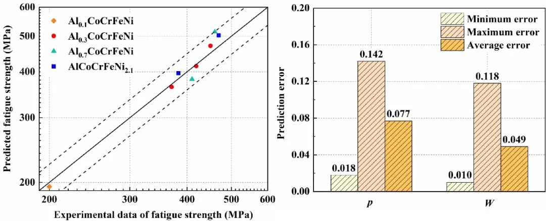 首先,建立可靠的疲劳特性预测模型,关键在于提出能够反映疲劳损伤从微观到宏观传递规律的有效评估指标。已有研究表明,滑移不可逆性是描述疲劳损伤演化的重要参数,但疲劳损伤不仅取决于不可逆变形的程度,滑移的局域化同样是疲劳裂纹萌生的重要内禀特性。针对这一问题,本文提出了一套可同时考虑循环滑移的不可逆性和局域化特征的理论方法,即滑移不可逆局域化(Slip irreversibility localization, W)指标。通过分子动力学模拟手段,研究在原子尺度实现了对合金材料中滑移不可逆局域化特征的定量度量,从而实现对疲劳损伤参量的高效量化分析。研究所采用材料为典型的AlxCoCrFeNiy高熵合金,其Al和Ni含量可变,包括四种代表性组分:Al0.1CoCrFeNi, Al0.3CoCrFeNi, Al0.7CoCrFeNi和AlCoCrFeNi2.1。结果表明,不同化学成分和微观变形机制对合金的滑移特征具有显著影响,并且这种影响是复杂的。所提的W指标能够反映这种由成分调控引起的变形机制差异,具有很好的微观组织敏感性,如图1所示。研究进一步从位错微观尺度探究了不同合金材料滑移不可逆局域化的差异性来源,发现位错行为对微观损伤演化极为敏感,并可将这种敏感性有效地传递至提出的W指标上。在此基础上,本文建立了基于W指标的高熵合金疲劳强度预测模型,预测结果与试验数据的偏差控制在12%以内,平均预测精度较基于滑移不可逆性的传统指标(P)提升36%,如图2所示。