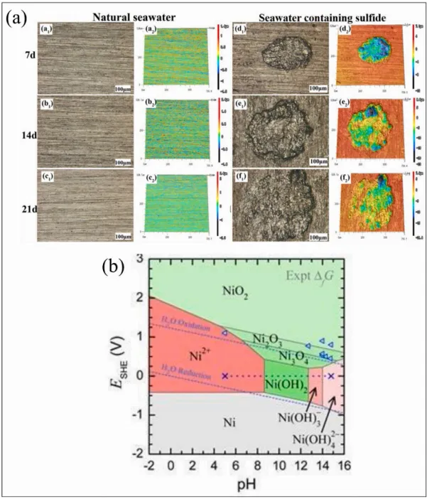 图9 (a) 铜镍70/30合金在天然海水及含硫化物海水中浸泡不同时间后的表面形貌与三维轮廓图;(b) 氢氧化镍的电位-pH图(普贝图),展示pH-标准氢电极电位(EMF/V vs. SHE)关系