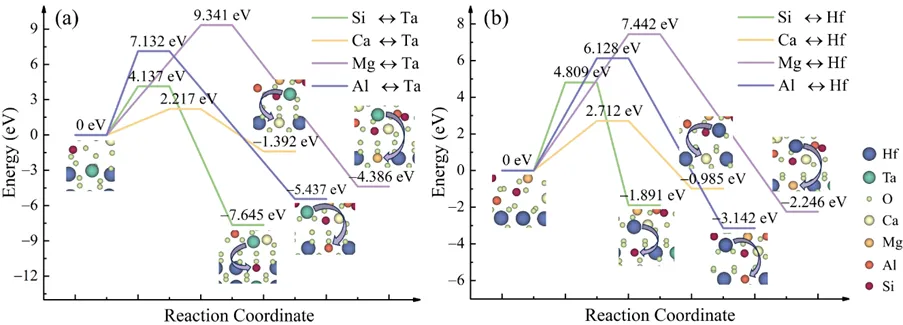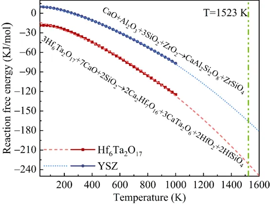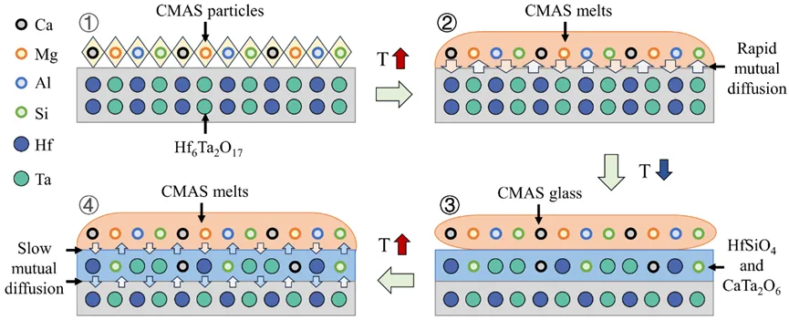 文章引用: Zhou Q, Wang Q, Yang L,Zhou Y. Investigating CMAS corrosion in ultrahightemperature Hf6Ta2O17-based thermal barriercoatings: A mechanism by which corrosion productshinder corrosion resistance. MGE Advances. 2025;e70018. https://doi.org/10.1002/mgea.70018 摘要 Hf6Ta2O17陶瓷兼具优异的热学与力学性能,并具有高达2244 °C的相变温度,被认为是新一代超高温热障涂层(TBCs)的理想候选材料。然而,在高温服役条件下,钙镁铝硅酸盐(CMAS)熔体对热障涂层的化学腐蚀是导致其结构失效的关键因素之一。为揭示Hf6Ta2O17在高温下优异抗CMAS腐蚀性能的内在原因,本文基于密度泛函理论(DFT)对CMAS/Hf6Ta2O17体系进行了界面反应与扩散行为分析。结果表明,CMAS与Hf6Ta2O17之间的相互作用具有较低的反应能,促使界面能够快速生成致密而稳定的腐蚀产物层,主要由CaTa2O6和HfSiO4组成。该反应层显著降低了CMAS中元素向基体内部的扩散速率,从而有效阻止了腐蚀的进一步发展。这种界面自钝化机制使Hf6Ta2O17在高温CMAS环境中表现出优异的化学稳定性,进一步强化了其作为下一代超高温热障涂层材料的应用潜力。