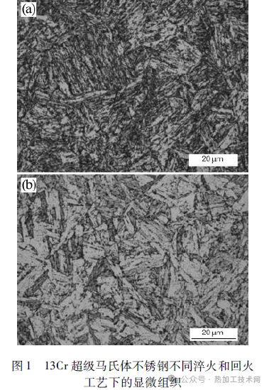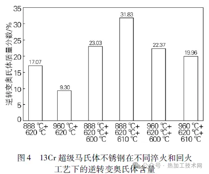 1) 888℃×1h亚温淬火+620℃×6 h回火后13Cr超级马氏体不锈钢的组织主要为回火马氏体,铁素体和逆转变奥氏体,960℃×1h淬火+620℃×6h回火后的组织主要为回火马氏体与逆转变奥氏体。在同等回火次数与回火温度下,888℃亚温淬火的组织更细小,析出的碳化物更多,同时产生的逆转变奥氏体更多,二次回火同样有助于细化组织。 2) 888℃×1h水淬+620℃×6h回火+610℃×3h回火后13Cr超级马氏体不锈钢的逆转变奥氏体含量最高,硬度与屈服强度最低,低温冲击性能最高。 3) 亚温淬火产生的铁素体有助于逆转变奥氏体的形成,铁素体与逆转变奥氏体共同作用,有利于降低马氏体不锈钢的硬度,提高马氏体不锈钢的低温冲击性能,提升马氏体不锈钢的综合力学性能。