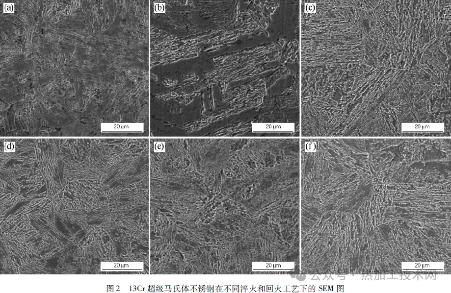 2.1 微观组织形貌 图1为13Cr超级马氏体不锈钢经淬火+一次回火后的显微组织。可以看出,888℃+620℃试样的晶粒明显比960℃+620℃试样更细小,碳化物也明显更多,大量的黑色碳化物与铁素体分布在马氏体板条交界处和马氏体的内部。经测定,888℃+620℃和960℃+620℃试样的晶粒度分别为7.5级和8.0级,且晶粒中无带状组织。 图2为13Cr超级马氏体不锈钢在不同淬火+回火工艺下的SEM图,可以明显地看到原奥氏体晶界与马氏体组织,片状马氏体在原奥氏体内形成并具有一定取向,同一奥氏体晶粒中一般具有多个不同取向的马氏体组织。对比图2(a,b) 可以看出,进行一次回火时,888℃+620℃试样的马氏体更加细小,而960℃+620℃试样的马氏体相对于888℃+620℃试样更加明显,且马氏体边界呈亮白色,这种高亮马氏体组织为富Ni马氏体组织,该马氏体组织中富含大量的奥氏体稳定元素Ni。当其中Ni达到一定含量时能够将高温逆转变奥氏体组织保留至室温,一般逆转变奥氏体也在富Ni马氏体组织周围形成,如图2(c) 所示。同时,888℃+620℃试样的组织中存在大量铁素体,在进行二次回火后出现大量的富Ni马氏体组织与逆转变奥氏体,如图2(c,d) 所示。相比于888℃+620℃+610℃试样,888℃+620℃ + 600℃试样的铁素体更加细小,富Ni马氏体更加细小且分布更加均匀。另外,由图2(e,f) 可见,对960℃+620℃试样进行600和610℃二次回火后得到的富Ni马氏体含量更多,马氏体板条更加明显,同时马氏体板条也更加细小,这表明二次回火能使得马氏体不锈钢组织细化,提高马氏体不锈钢逆转变奥氏体的含量。 对比图2(c,d) 和图2(e,f) 可知,888℃+620℃+600℃试样和888℃+620℃+610℃试样的富Ni马氏体更多,马氏体间距更小,产生的逆转变奥氏体更多,但铁素体也更多。这是因为铁素体能够细化马氏体板条,增加逆转变奥氏体的形核点,提高逆转变奥氏体含量。在一次回火时,高温下能产生大量的逆转变奥氏体,但由于奥氏体稳定元素的含量不足,在室温时大量的高温逆转变奥氏体重新转变为富Ni马氏体。在二次回火时,富Ni马氏体为逆转变奥氏体提供大量的形核位置,使得高温逆转变奥氏体大量形核,即使在二次回火冷却时一些Ni 含量不足的逆转变奥氏体会重新转变为新的马氏体,从而降低逆转变奥氏体含量,但仍有大量的逆转变奥氏体被保留至室温,因此二次回火后的试样相较于一次回火后的试样具有更多的逆转变奥氏体以及更加细小的富Ni马氏体组织。 综合来看,888℃亚温淬火+回火后的组织主要为回火马氏体+铁素体+逆转变奥氏体,960℃淬火+回火后的组织主要为回火马氏体+逆转变奥氏体,所有工艺回火后都出现了亮白色的富Ni 马氏体组织以及碳化物,亚温淬火+回火后的组织比淬火+回火后的组织更加细小。 2.2 XRD分析 图3为13Cr超级马氏体不锈钢在不同淬火+回火工艺下的XRD图谱。可以看出,二次回火后的试样中存在明显的( 111) γ奥氏体峰,而在淬火+一次回火的试样中的( 111) γ奥氏体峰相对而言并不明显。结合显微组织分析可知,在888℃+620℃试样中铁素体与回火马氏体共存。王鹏证实,13Cr超级马氏体不锈钢在本文所用的淬火区间淬火时基本不会产生残留奥氏体。同时残留奥氏体与逆转变奥氏体的XRD图像也不同,残留奥氏体的XRD图像中的峰并不对称,这与逆转变奥氏体的对称图像不同。 图4为13Cr超级马氏体不锈钢在不同淬火+回火工艺下的逆转变奥氏体含量。可以看出,进行一次回火时,888℃+620℃试样的逆转变奥氏体含量相对于960℃+620℃试样提升了83.55%。在进行二次回火后,逆转变奥氏体含量明显增加,其中888℃+620℃+610℃试样较888℃+620℃ 试样增加了86.70%,960℃+620℃+600℃试样较960℃+620℃试样增加了140.54%。因此,适宜的二次回火能够显著增加马氏体不锈钢中逆转变奥氏体的含量。这是因为在一次回火的加热阶段时,逆转变奥氏体会在马氏体边界或其他异质点形核。在保温阶段时,大量的奥氏体稳定元素(Ni、C) 会通过扩散聚集在逆转变奥氏体内,使逆转变奥氏体长大。在冷却阶段时,由于部分逆转变奥氏体内的稳定元素不足,使得逆转变奥氏体重新转化为新的马氏体。新的马氏体同样因内部含有大量的奥氏体稳定元素,当进行二次回火时,逆转变奥氏体优先在此处形核并长大,随后在保温阶段时,逆转变奥氏体内的稳定元素重新聚集,使得第二次回火保温阶段的逆转变奥氏体含量高于一次回火保温阶段,虽然在冷却过程中依然有一部分稳定元素含量不足的逆转变奥氏体转化为马氏体,但当冷却到室温时,二次回火后的逆转变奥氏体含量依然比仅进行一次回火时更高。 另外,对比不同二次回火后工艺的逆转变奥氏体含量可知,888℃+ 620℃+610℃试样比888℃+620℃+600℃试样增加了38.21%,960℃+ 620℃+600℃试样比960℃+620℃+610℃试样增加了12.07%,表明回火温度对逆转变奥氏体含量有着一定的影响。而888℃+620℃+610℃试样比960℃+620℃+610℃试样增加了59.47%。说明亚温淬火后产生的铁素体能有效地增加马氏体不锈钢的逆转变奥氏体含量。这可能是因为铁素体的存在使得边界增加,增加回火时逆转变奥氏体的形核点,提高逆转变奥氏体的形核几率。逆转变奥氏体在铁素体周围大量形核,即使在冷却过程中有损耗,仍然有大量的逆转变奥氏体保存至室温。 综上,888℃×1h水淬+620℃×6h 回火+610℃×3h 回火试样的组织中具有最多的逆转变奥氏体组织,铁素体有利