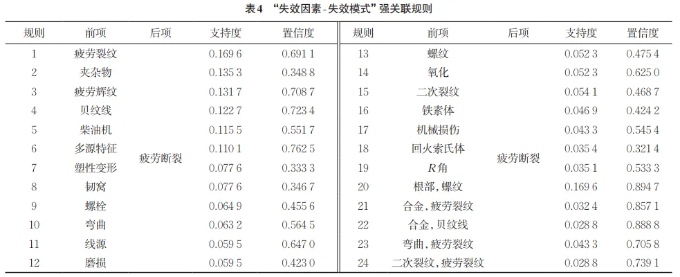 失效分析是对产品故障进行系统化分析和研究的过程,涉及工程学、材料科学、计算机科学等多个领域。失效分析工程师通过对失效部件的服役环境、工艺类型及断口特征等多种关键因素进行综合分析,找到失效的根本原因,并制定有效的预防和改进措施。有效的失效分析对提高产品的可靠性和安全性具有重要意义,其广泛应用于航空、航天、航海、汽车制造、电子设备和医疗器械等多个领域。近年来,对产品的可靠性要求日益提高,同时产品的功能、结构、受力、服役环境等越来越复杂,传统的人工失效分析方法难以从大量数据中找到失效的关键因素,以及因素间的耦合关系,且人工法受专家经验的影响较大,分析过程须耗费大量精力。 为了应对失效分析不断增大的复杂性,自然语言处理和数据挖掘等技术成为提高失效原因诊断效率的有效手段,近年来该技术在失效分析领域得到广泛应用。随着失效分析工作的逐年开展,失效分析案例逐渐增多,蕴含的数据价值不断显现。应用自然语言处理技术对大量失效分析文档进行文本挖掘,提取文本特征,并结合各类数据挖掘方法对文本特征进行分析,对识别失效模式和潜在失效风险等极具应用价值。LIU等应用自然语言处理技术对管道事故叙述文本数据进行文本挖掘,并结合K-means聚类分析方法,识别造成管道事故的影响因素,为管道系统的维护和安全管理提供了科学依据。HALIM等综合分析了多个管道事故数据库,开发了一种基于大数据和机器学习技术的因果模型,揭示了不同因素之间的复杂关系,研究成果在提高管道事故风险预测准确性等方面具有重要作用。CHOKOR等对建筑领域大量事故报告进行文本挖掘,采用聚类分析方法对建筑事故报告类别进行划分,提高了事故报告的处理效率。杨晓等设计并建立了船舶系统典型材料失效分析案例数据库,通过对船舶系统失效案例的多层级分类,提高了失效分析工程师获取信息的效率。 关联规则挖掘是数据挖掘领域中的重要研究课题之一,其在发现事物间隐藏关联关系的数据挖掘场景下具有良好的表现。失效原因排查及诊断过程涉及的失效因素种类多,各因素间相互影响。应用关联规则对失效分析案例数据进行分析、挖掘,形成失效分析关联知识并保存,对产品失效原因的推理具有重要意义。 然而,自然语言处理和数据挖掘等技术在失效分析领域起步较晚,且聚焦在具体的领域,如管道事故、换流站故障,以及轨道电路故障等,缺少可以覆盖不同类型应用场景的统一模型框架,且现有研究对失效文本的挖掘方法通常为聚类分析、神经网络等,这些方法对分析结果的可解释性较差,不利于对产品失效原因进行推理。与此同时,现有的关联规则挖掘研究大多与算法效率提升有关,较少研究失效案例分析与应用的改进方法。因此,在失效分析领域,如何根据失效案例数据的实际特点及结构,结合自然语言处理技术,应用关联规则挖掘方法实现失效分析案例的分析挖掘,建立失效因素关联路径,辅助提高失效原因排查的效率、准确性,成为亟待解决的问题。 针对在复杂应用场景下,传统失效分析技术难以在大量数据中发现失效因素和失效原因间潜在关系的问题,研究人员提出了一种结合自然语言处理技术、关联规则挖掘算法的失效分析案例文本挖掘方法,同时发明了基于Apriori算法的两阶段失效分析案例文本关联规则挖掘方法,建立了失效分析案例文本挖掘方法框架;对某船舶单位的失效案例文本进行了有效验证,研究结果对产品失效原因诊断和故障作用机制解释方面具有重要的辅助借鉴作用。 基于Apriori算法的失效分析案例文本挖 掘方法框架设计 基于Apriori算法的失效分析案例文本挖 掘方法优化与工程应用 结论与展望