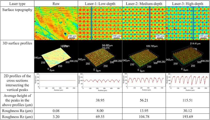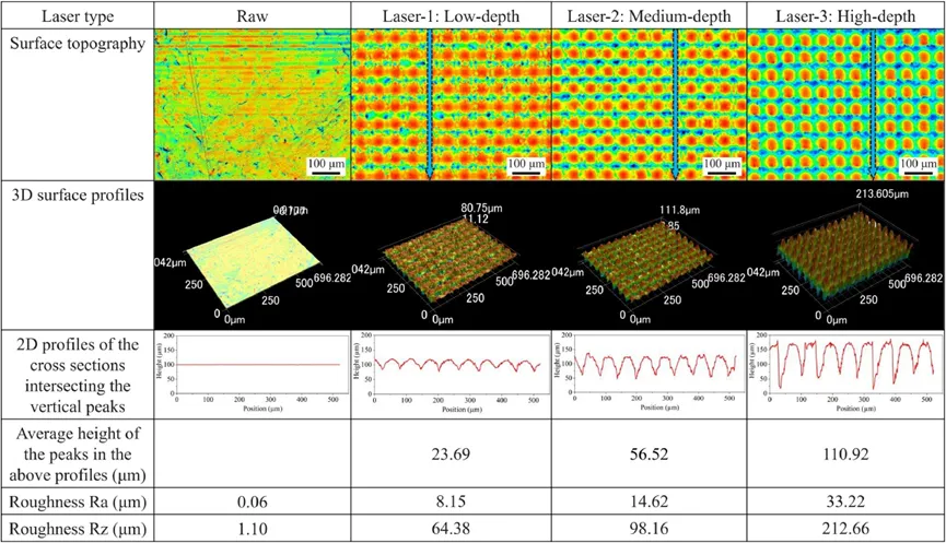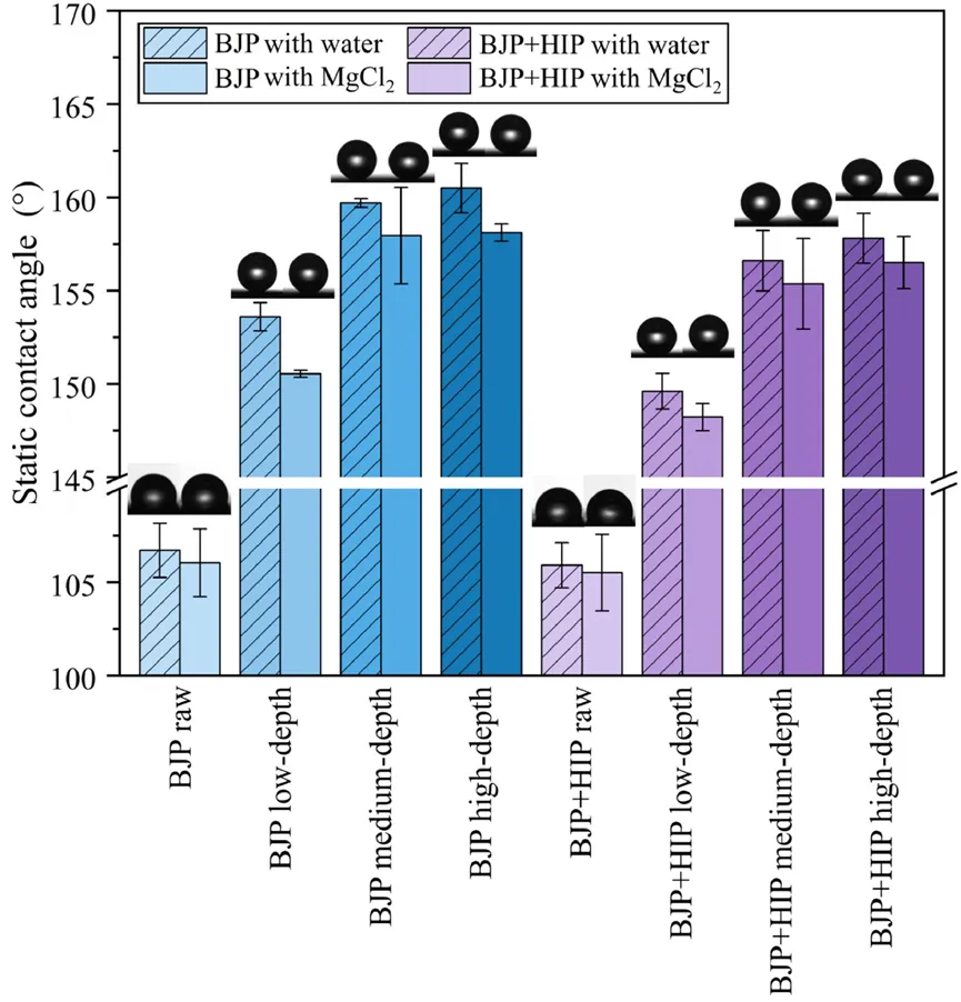 FLT通过200、400、800次扫描形成低、中、高深度微织构,表面粗糙度随扫描次数增加而升高,Ra:8.15→14.62→33.22μm。中、高深度织构使BJP与BJP+HIP 316L呈“荷叶效应”超疏水性,接触角>150°,滞后角<10°,低深度织构仅使BJP 316L超疏水和BJP+HIP 316L疏水。