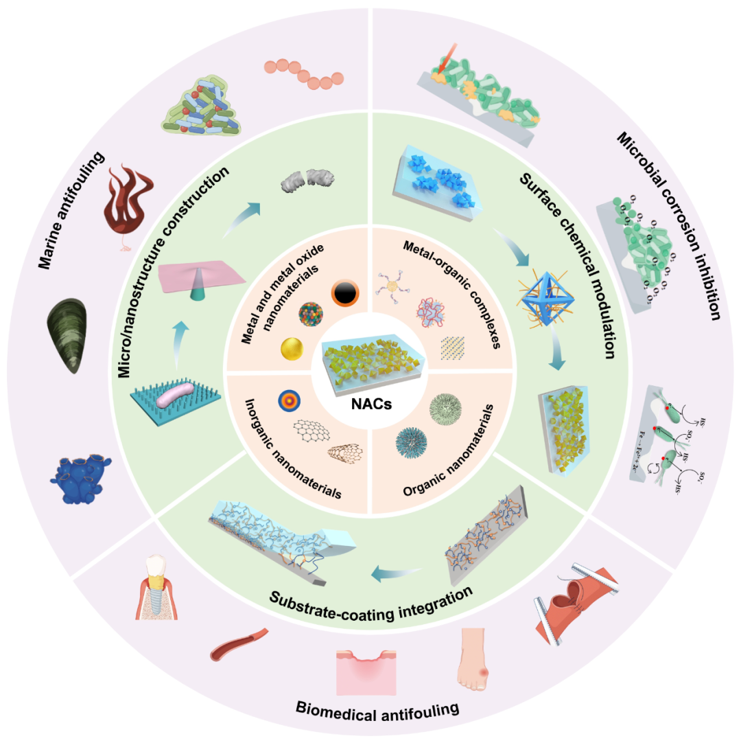 第一作者:李祥宇研究员、于智群研究员、王健阳博士 通讯作者:徐大可教授 通讯单位:东北大学材料科学与工程学院,数字钢铁全国重点实验室 原文链接:https://doi.org/10.1002/adma.202514795 微生物形成的顽固生物被膜对生态环境、工业设备和公共健康构成了持续威胁。近年来,抗菌纳米材料的研究取得了显著进展,该类材料能够将细菌活性降低数个数量级,已经成为高效广谱的抗菌策略。它们不仅能够有效抑制细菌增殖与生物膜形成,还能显著延缓耐药性发展进程。将纳米材料嵌入涂层或构建本征纳米结构是一种高效、经济且环保的防污策略,显著提升了材料的实用性。通过合理的界面工程设计,这类纳米复合涂层可在多种基材上形成兼具机械强度与耐久性的防护表面,从而拓展其在生物医学、环境保护及能源等领域的应用前景。本综述系统梳理了纳米防污涂层的设计理念,重点探讨界面与微生物相互作用之间的内在联系。概述了功能涂层中常用的抗菌纳米材料,阐明其基本特性及防污机制;随后分析纳米复合材料界面工程的设计原理,着重讨论影响防污性能、机械性能与耐久性的关键构效关系。并进一步介绍了该类材料在海洋防污、防腐与生物医学领域的前沿应用,在此基础上总结了纳米防污涂层在基础研究与实际应用中面临的主要挑战,并对未来研究方向提出展望,以促进纳米材料特性向宏观防污性能的有效转化。 图1. 纳米防污涂层的设计原则与应用概述。 【抗菌纳米材料分类】 该综述系统梳理并深入讨论了一系列具有代表性的抗菌纳米材料。通过对比分析,揭示了纳米结构单元与宏观抗菌性能之间的内在联系,为理解其作用机制提供了新的视角。抗菌纳米材料因其形态、尺寸、元素组成、合成方法及表面修饰方式的多样性,展现出在抑制微生物定殖及生物膜形成方面的独特优势。这类材料涵盖了金属和金属氧化物纳米材料、金属有机络合物,以及有机和无机纳米材料等多种类型。不同形态的纳米材料在强化与细菌脂质双层的相互作用中起着关键作用,特定的形貌设计可增强局部粘附力、调节膜张力,从而通过精确调控物理化学参数,实现对微生物的有效干预。该综述重点分析了目前常用抗菌纳米材料的化学组成、形态特征、作用机理、性能优势及局限性,并探讨了其在未来纳米抗菌研究与应用领域中的重要意义。 【纳米防污涂层界面工程】 抗菌纳米材料在不同的技术领域表现出卓越性能,但其实际应用往往受到多种因素的制约,包括长期功效有限、可回收性难以实现、生物相容性较差以及明显的聚集倾向。针对这些问题,合理的涂层设计可有效减轻限制。通过设计具有优化表面化学性质的涂层,将单个纳米材料进行物理隔离,可抑制因聚集导致的性能衰减,同时提高材料的环境稳定性和使用寿命。因此,结构与化学的界面工程被认为是开发可扩展、高性能NACs的关键手段。涂层设计提供了三种互补的调控策略,可以协同优化性能:微/纳米结构构造(图2)、表面化学性质调控(图3)和基底与涂层整合(图4)。其中,微/纳米结构构造通过改善形貌特征,有效防止生物污染;表面化学性质调控则优化了抗菌纳米材料与涂层基质之间的相互作用;基底与涂层整合则提升了材料的机械强度和长期耐久性。该综述总结了构建高性能NACs体系的关键因素,并探讨了相应的设计与合成策略,为开发具有所需功能和性能的抗菌涂层提供了重要参考和指导。 图2. 机械杀菌纳米结构与超疏水微/纳米结构的防污机理及性能评价。 图3. NACs的共价与非共价表面改性策略。 图4. 引入生长位点以实现NACs的高耐久性和机械坚固性。 【纳米防污涂层应用】 经过几十年的研究,NACs因其多样化的化学组成和网络拓扑结构,成为多种关键应用的理想候选材料。通过界面设计,NACs在实际使用条件下展现出显著的耐久性。凭借卓越的抗菌、防腐及界面调控性能,NACs能够有效解决细菌污染和微生物腐蚀等传统难题。此外,它们在预防医疗植入物感染、提升能源设备耐用性等领域表现出广阔应用前景。 近年来,纳米抗菌材料与生物高分子及其他活性剂的结合催生了多功能涂层,具备高效抗菌、可控释放和抗污能力,为医疗、海洋及能源等领域提供了新解决方案。NACs不仅能阻止细菌附着和生物膜形成,还兼顾生物相容性,为临床植入物、创伤护理和防污涂层提供保障。然而,安全性和长期有效性仍是挑战。金属及金属氧化物纳米颗粒在体内或环境中可能引发细胞毒性、炎症反应或干扰微生物生态。细菌与哺乳动物细胞膜的结构差异为设计选择性抗菌策略提供思路,例如利用带正电荷的功能基团靶向破坏细菌膜,同时保护哺乳动物细胞。长期使用下,死细菌和生物膜堆积可能削弱涂层性能,而细菌也可能在非杀伤性压力下产生耐药性,因此对耐药机制的理解和涂层优化至关重要。 未来,NACs的发展趋势主要包括创新刺激响应型材料,通过pH、光、温度或生物化学信号实现精准、实时的抗菌和防污控制;智能化材料设计,利用人工智能和机器学习快速筛选、优化纳米材料组成和分级结构,实现高效、可控的涂层性能;以及跨学科合作与工业化整合材料科学、化学、工程和计算机科学,解决大规模制备、稳定性问题。总体而言,多功能、智能化的NACs为抗生物污染和细菌感染提供了可持续、经济且高效的