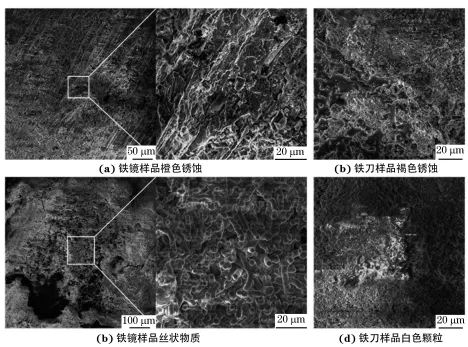 由图4可见:铁镜锈蚀颗粒为橙色锈蚀,具有条痕状貌,其邻近区域发现有一个布满丝状物的区域。该丝状物形貌与细菌菌丝类似。微生物致铁器锈蚀在国内外研究中已有较多报道,如铁细菌、氧化亚铁硫杆菌和硫酸盐还原菌等均可引发铁器锈蚀,因此结合该区域形貌特征其应为铁细菌。铁刀的褐色锈蚀呈颗粒状,白色区域颗粒中夹杂少量针状物[图4(d)],根据形貌特征推测其为碳酸钙的不同晶体形态。