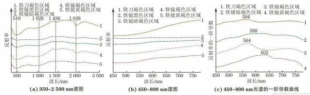 在可见光波段,各区域的光谱特征与其颜色特征相符,见图2(b):黑色区域的光谱呈“斜线”形,符合黑色系物质的反射光谱特征;暗褐色、褐色和黄褐色区域的光谱均呈现“S”形,与红黄色系物质的反射光谱特征一致。对这三个区域的光谱进行一阶导数分析[图2(c)] 发现,暗褐色区域在588nm处出现特征峰,与赭石(Fe2O3) 的标准特征峰吻合,表明该区域富含赤铁矿。