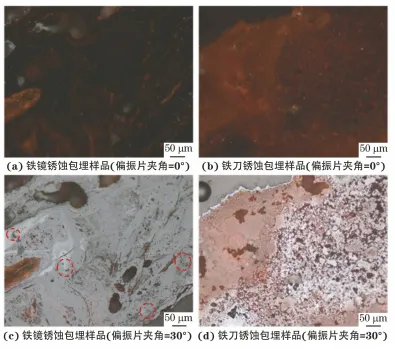 由图8可见,铁镜锈蚀包埋样品未见明显分层,黑、褐色的锈蚀对偏振光的响应速度大致有两种。较亮区域伴随有微小蓝色亮点,应为由表面纳米晶体层形成的薄膜干涉光。在铁锈中,只有晶体粒度较小的赤铁矿和纤铁矿可能具有纳米层,而较亮区域在自然状态下颜色近黑,故较亮区域更可能为致密结晶的赤铁矿,而大面积的较暗区域应为磁铁矿。铁刀锈蚀包埋样品外侧为橙色、内侧为褐色,外侧对偏振光的响应速度远低于内侧且外侧边缘有一层内侧物质[图8(d)],外侧应为疏松赤铁矿、内侧应为纤铁矿,纤铁矿的产生早于赤铁矿。