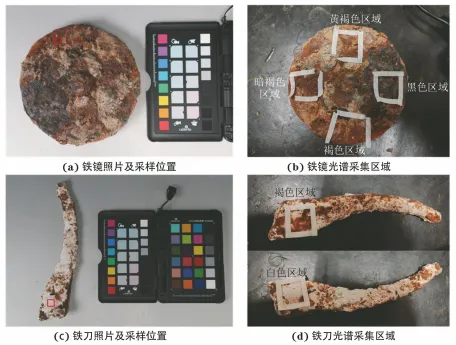 图1 出土铁镜和铁刀照片、锈蚀产物样品采样位置,以及高光谱谱图采集区域
