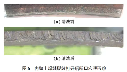 开裂反应釜的宏观形貌如图1所示,开裂位置为靠近釜底处。 反应釜与釜身通过焊接连接,焊接前在釜内壁各预制了一层镍板,然后在外部实施焊接,形成外焊缝。为增加内部密封性,厂商在完成外部焊接后,在内壁又增加了一层镍板(即附加镍板),然后在其上下两处实施焊接,于内壁形成上焊缝和下焊缝 (见图2)。 使用内窥镜检查釜内裂纹分布情况,结果如图3所示。由图3可知:共发现4处裂纹,其中位置1的裂纹出现在下焊缝,位置2~4的裂纹出现在上焊缝,4处裂纹均在焊道中部,裂纹附近呈较明显锈蚀色。 釜外部共有两处发生区域性渗漏,分别与内部位置1,2,以及位置3,4的侧焊缝裂纹处相对应(见图4)。外部裂纹主要沿焊缝边缘的焊趾部位扩展,渗漏区域附近不锈钢釜体发生严重锈蚀,可见大量褐色锈蚀产物附着。 取下部分附加镍板后,观察釜内壁的宏观形貌如图5所示。由图5可知:外焊缝裂纹完全沿焊趾边缘扩展;附加镍板的焊缝边缘裂纹为位置3的裂纹;预制镍板未能完全覆盖住不锈钢釜体,在外焊缝附近有多处裸露,若附加镍板开裂后,釜内的溶液可以直接接触到釜体的焊缝位置。 经观察,位置1~4各外焊缝断口特征一致,各内壁焊缝断口特征一致,选取位置3为代表进行分析。 将内壁上焊缝裂纹人工打开,断口清洗前,断口表面呈灰色+红褐色,表面较脏,可见较多附着物;使用铬酸-硫酸溶液清洗断口后,表面相对干净,断面呈暗灰色(见图6)。 将外焊缝裂纹人工打开,断口清洗前,断口表面呈红褐色,表面较脏,可见较多泥纹状的腐蚀产物;使用铬酸-硫酸溶液清洗断口后,表面相对干净,断面呈黄灰色(见图7)。 内壁断口清洗后的SEM形貌如图 8所示。由图8可知:断口可见典型的柱状晶轮廓,裂纹沿焊缝区域的柱状晶粒晶间开裂;晶面上氧化痕迹较严重。对清洗后断口表面进行能谱分析,发现O元素含量较高(质量分数为25%)。 外部断口清洗后SEM 形貌如图9 所示。由图9可知:断口处可见二次裂纹,断口整体呈“冰糖状”的沿晶断裂特征。对清洗前断口进行能谱分析,得到O元素质量分数为40%,K元素质量分数为15%。 沿断口截取金相试样,将试样进行打磨、抛光、腐蚀处理,试样的低倍形貌如图10所示。由图10可知:内壁预制的镍板并没有完全覆盖住釜体钢板的焊缝表面;A区为外焊缝裂纹,沿焊缝边缘(即焊接热影响区)开裂,逐渐穿透釜体钢板;B区为釜体钢板主体区域;C区为附加镍板的焊缝裂纹位置。 A区显微组织形貌如图11所示,可见裂纹沿晶界开裂,且主裂纹还伴随有裂纹分叉的现象。B区釜体钢板的组织为奥氏体+ 变形滑移线,为典型的奥氏体不锈钢组织(见图12)。C 区附加镍板焊缝区域均呈柱状晶形貌,镍板断口附近的焊接组织呈柱状晶形貌,且在焊缝组织的内部还可见沿晶开裂的微裂纹(见图13)。