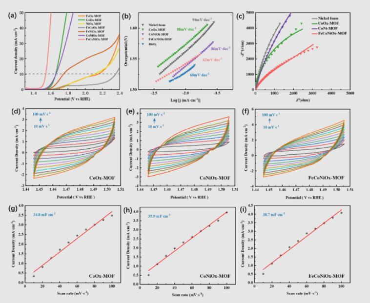 线性扫描伏安(LSV)测试清晰表明,FeCoNiOx-MOF的起峰电位最早,电流响应最为迅速。其达到10 mA cm⁻²电流密度所需的过电位为同组最优。对材料进行BET比表面积表征,FeCoNiOx-MOF表现出最大的比表面积(93.13 m²·g⁻¹),远超同组的CoOx-MOF(35.65 m²·g⁻¹), CoNiOx-MOF(38.01 m²·g⁻¹)。而电化学活性表面积(ECSA)的计算结果显示,FeCoNiOx-MOF的Cdl值为38.7 mF cm⁻²,优于CoNiOx-MOF(35.9 mF cm⁻²)和CoOx-MOF(34.8 mF cm⁻²)。进一步证明了FeCoNiOx-MOF拥有更大的活性比表面积。电化学阻抗谱(EIS)显示其具有最小的阻抗弧,表明电荷传输阻力最小。更值得一提的是,其Tafel斜率(62 mV dec⁻¹)低于贵金属基准RuO₂ (68 mV dec⁻¹),证明了其更优的反应动力学和本征活性。