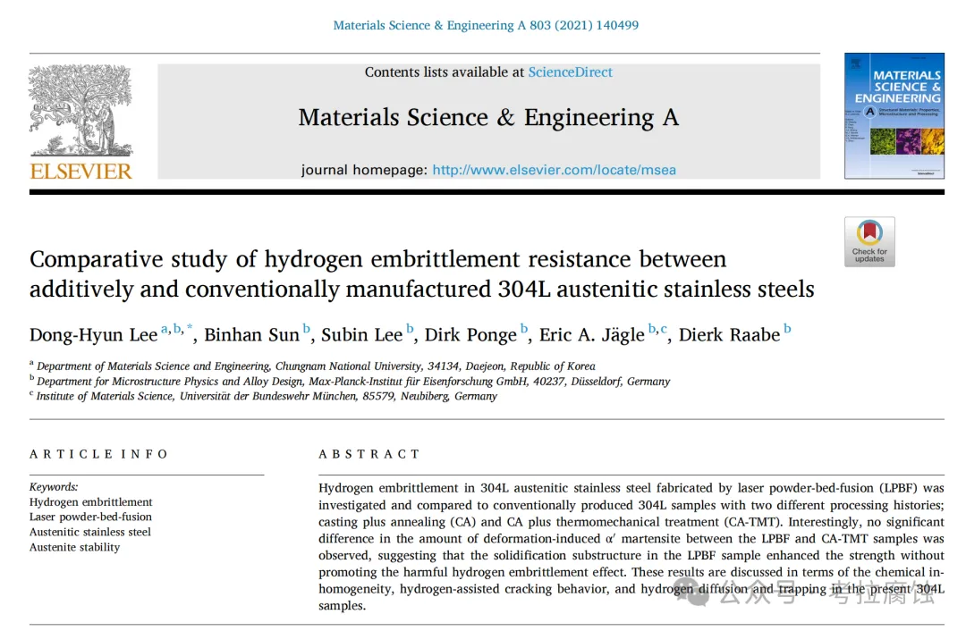 增材制造 | 增材制造与传统制造304L奥氏体不锈钢氢脆研究 Materials Science & Engineering A