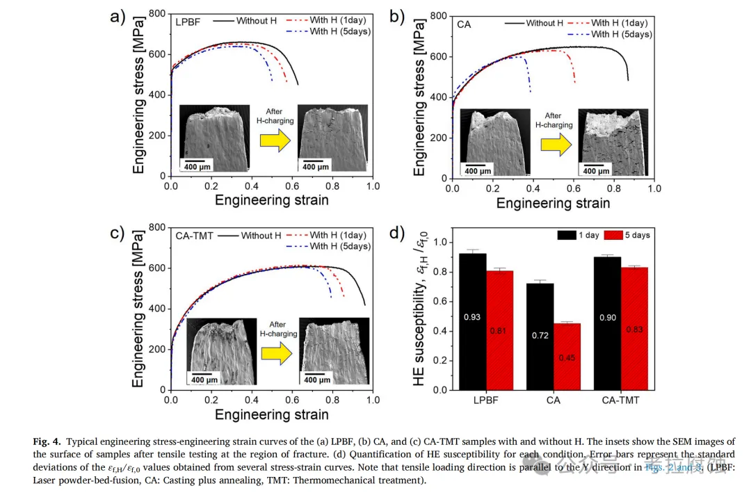 LPBF样品屈服强度约520MPa,CA样品约340MPa,CA-TMT样品约240MPa;延伸率LPBF样品约62%,CA样品约85%,CA-TMT样品约96%。 - 充氢后状态