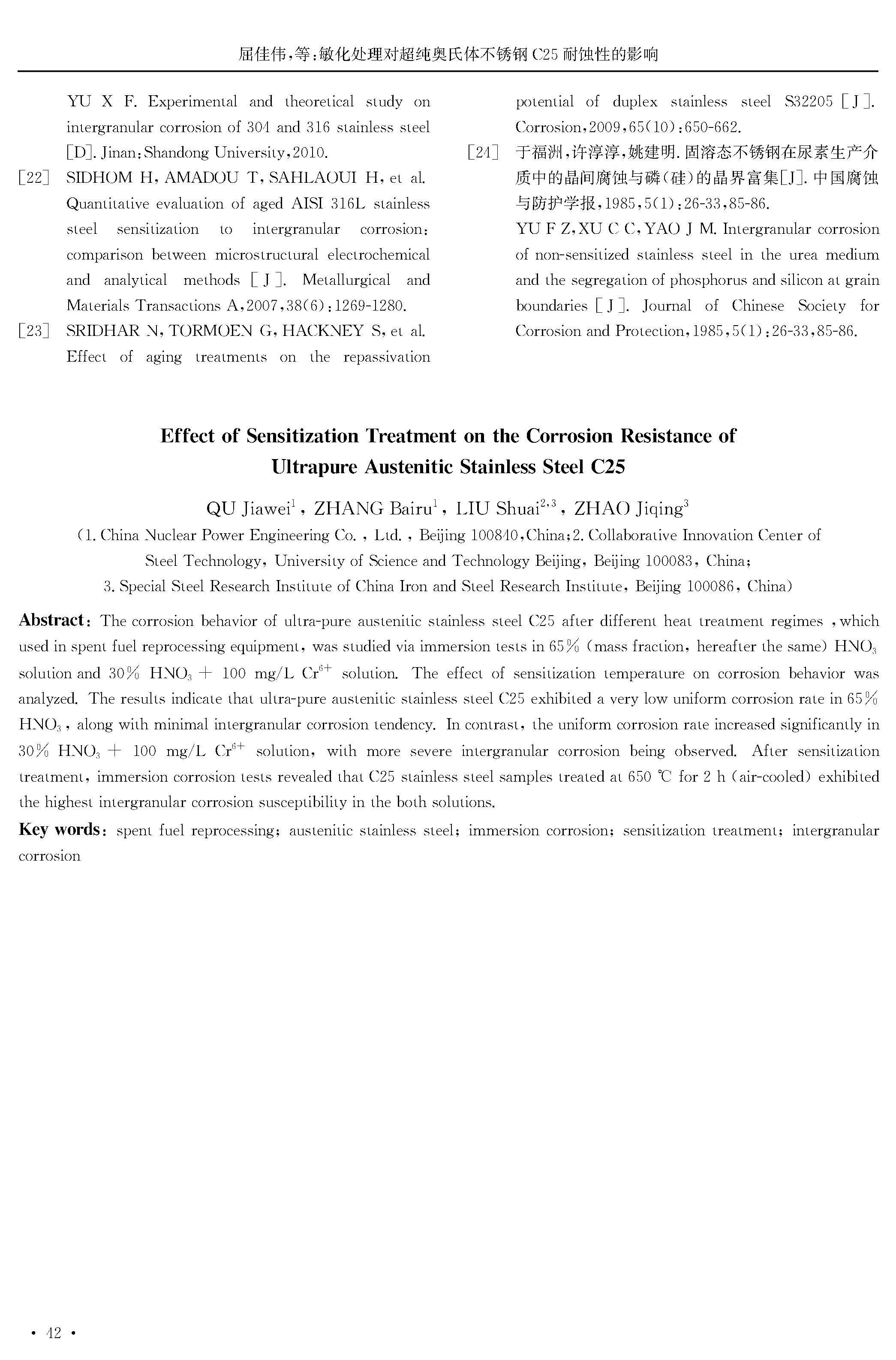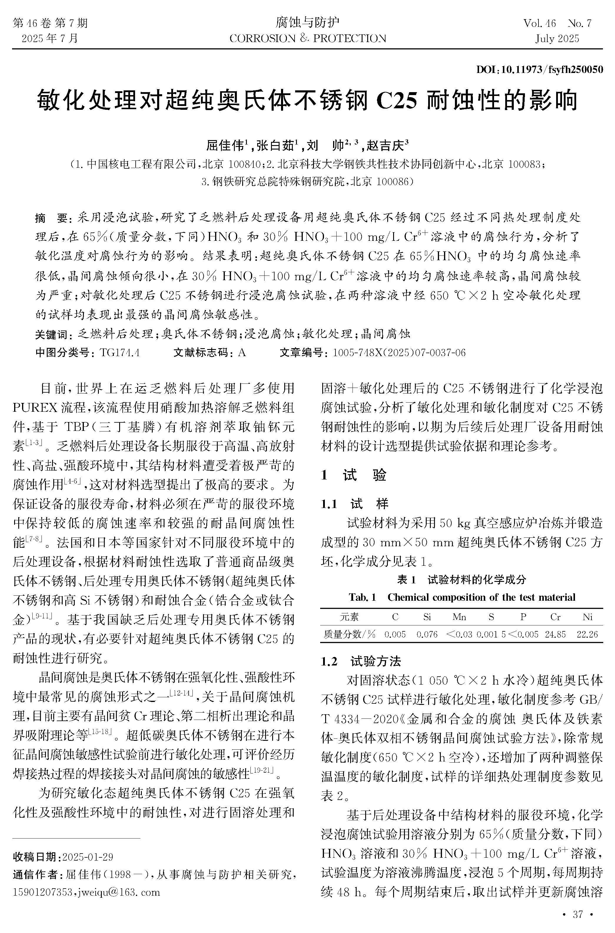 敏化处理对超纯奥氏体不锈钢C25耐蚀性的影响