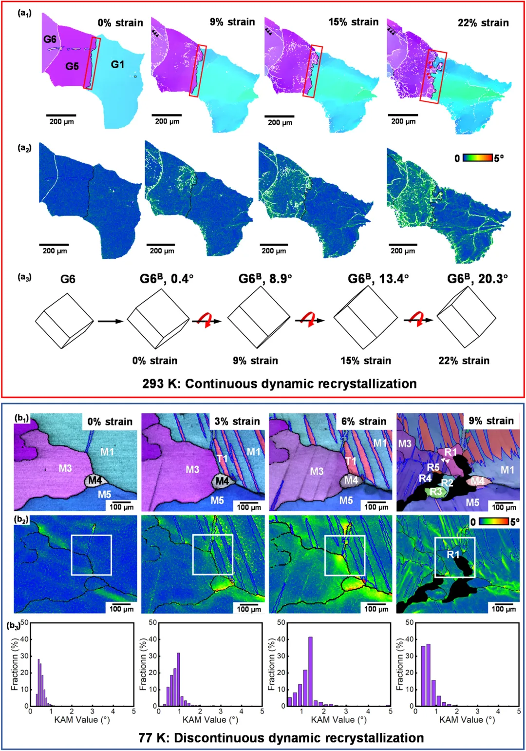 在293 K下,随着应变增加,晶粒内部取向逐渐发生连续变化,低角度晶界(LAGB)数量显著累积,表明变形主要通过位错滑移和后续的动态恢复来实现,最终演化为连续动态再结晶(cDRX)。