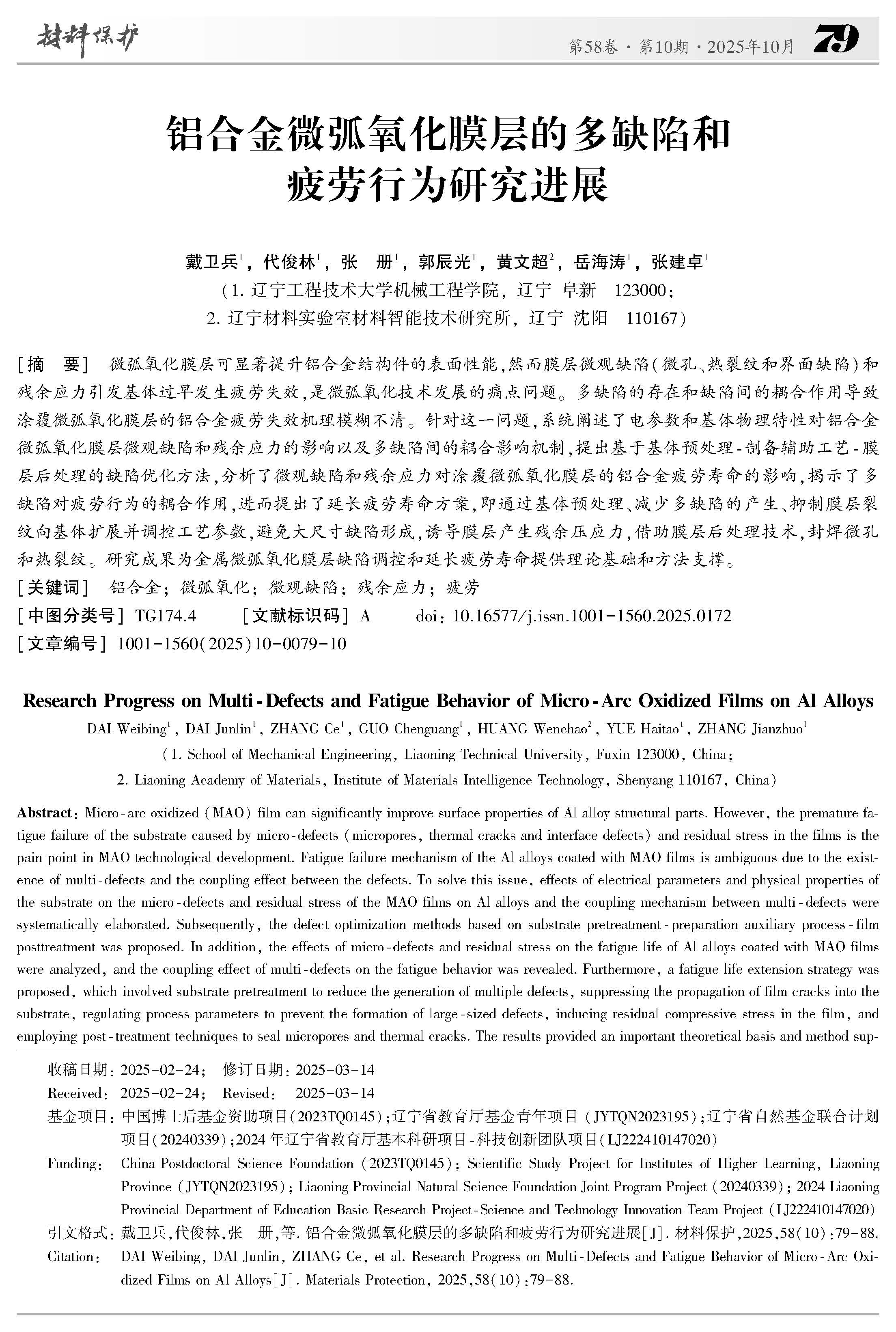 辽工程戴卫兵副教授:铝合金微弧氧化膜层的多缺陷和疲劳行为研究进展