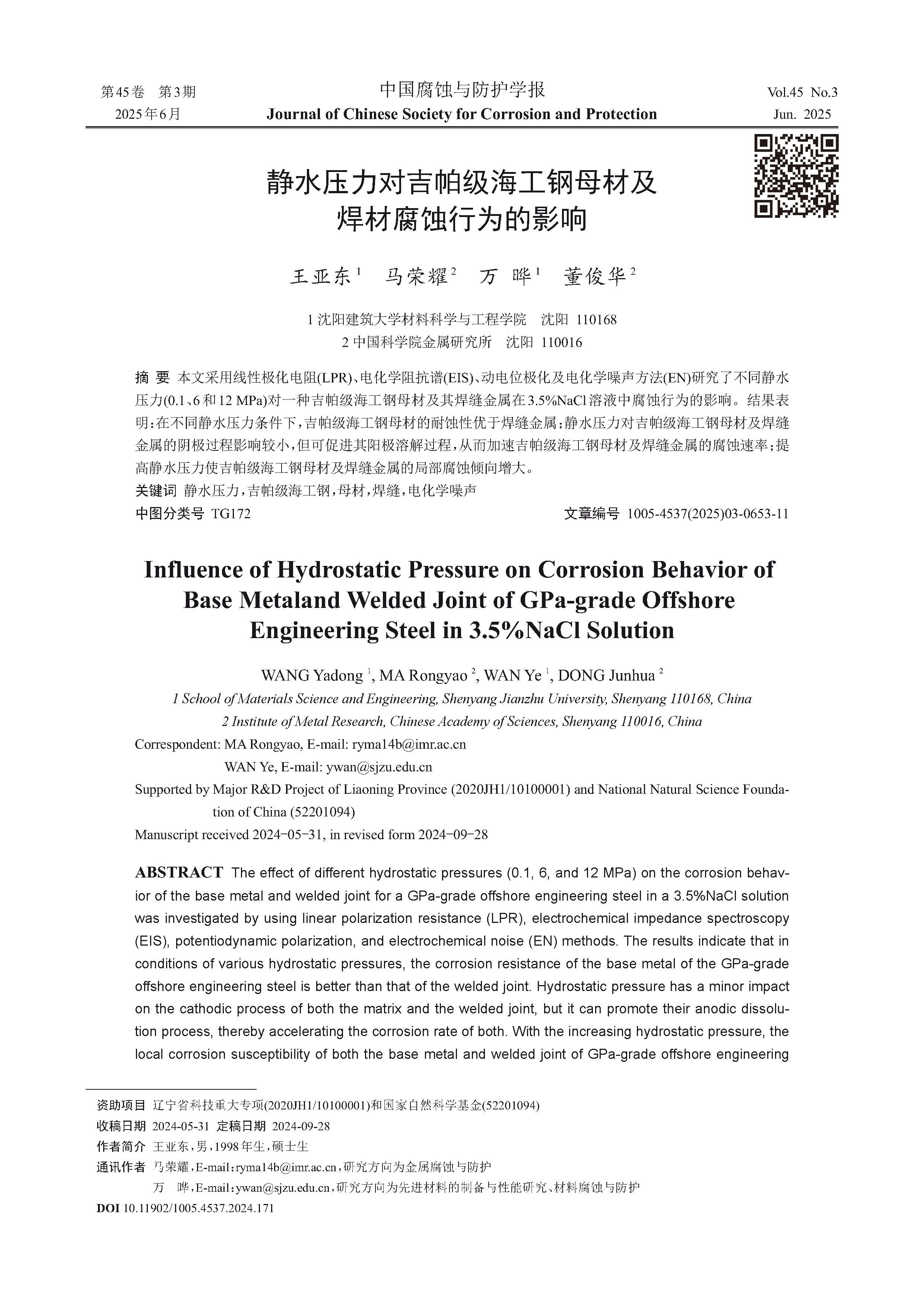 静水压力对吉帕级海工钢母材及焊材腐蚀行为的影响