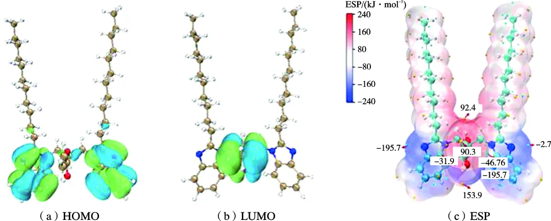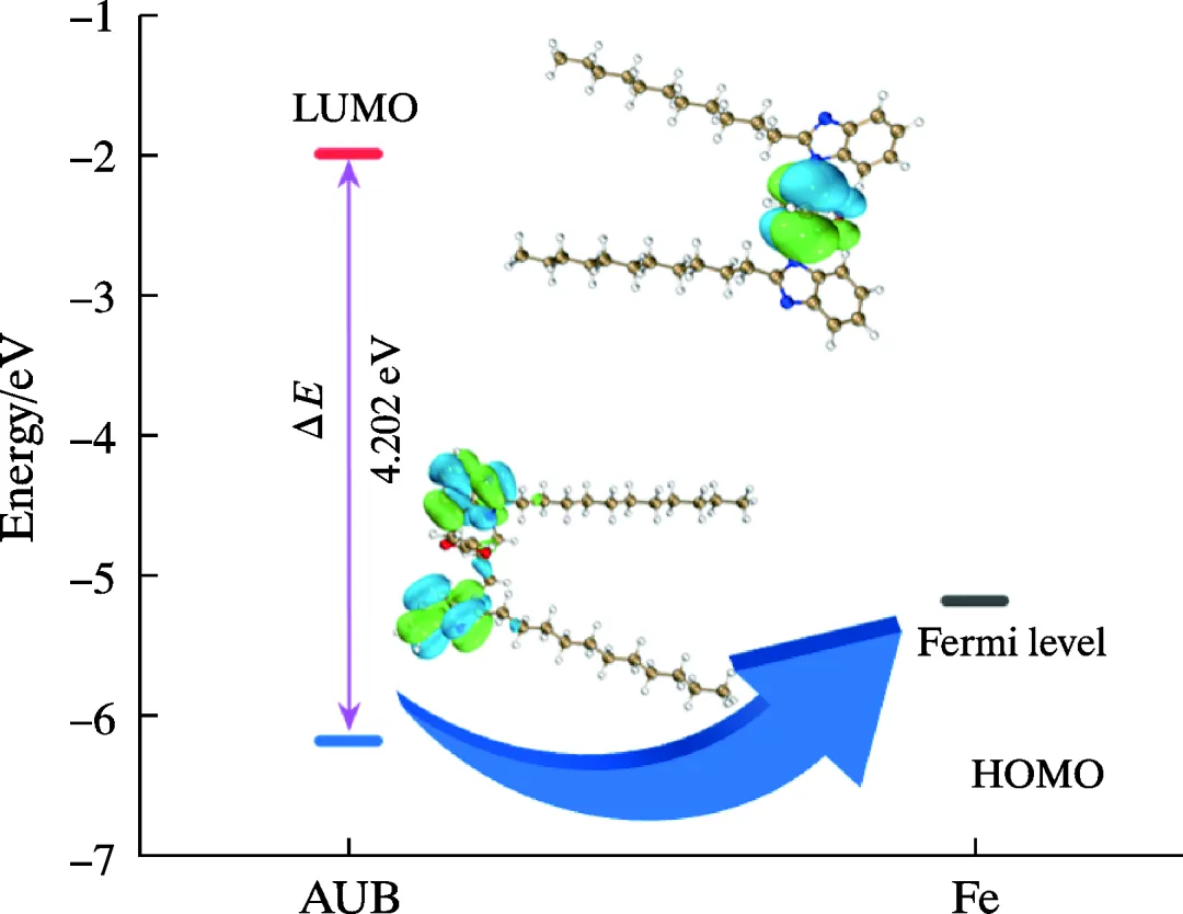 Highlight 1 AUB对Q235钢在酸性模拟油气田采出水溶液中表现了显著的缓蚀性能。AUB在Q235钢表面通过N、O杂原子与Fe原子之间的相互作用展现以化学吸附为主的混合型吸附。在298 K下,添加8×10-3 mol/L的AUB缓蚀效率可达90%,其缓蚀效率随着AUB浓度的增加而增大。在358 K下,仍能达到80%以上的缓蚀效率。对碳钢表面形貌进行表征后,可以明显观察到AUB在碳钢表面形成致密有序的薄膜结构。含C=C、羧酸酯基团的共轭链和中间短链包含高度电负性的共轭体系显著增加了AUB分子在Fe表面的活性吸附位点,并通过形成更多更短的化学键形成致密的保护膜,有效抑制了碳钢的腐蚀。 2 在阻垢性能方面,与基本的苯并咪唑相比,在AUB分子中引入含C=C、羧酸酯基团中间短链的共轭体系,有效提高了AUB在高垢质环境中的防护性能,和钙离子之间的配合抑制了钙离子的自由运动,AUB可以紧密吸附在CaCO3晶体的活性生长位点上,也可以物理吸附形式吸附在碳酸钙-方解石的表面上,从而可能阻碍其正常生长并抑制水垢形成。 3 在杀菌性能方面,AUB通过破坏SRB的生物膜来发挥作用,从而抑制SRB的生物活性。这种破坏不仅减少了SRB的直接腐蚀影响,而且加强了在存在SRB的环境中防止腐蚀的整体保护屏障。 4 量子化学计算结果显示,AUB分子的EHOMO(-6.179 eV)更接近EF,Fe,电子很可能从AUB分子的HOMO激发到碳钢表面,导致缓蚀剂吸附在金属样品表面形成薄膜,同时AUB具有较低的能隙(ΔE=4.202 eV),表明键合中的电子转移能力较高。