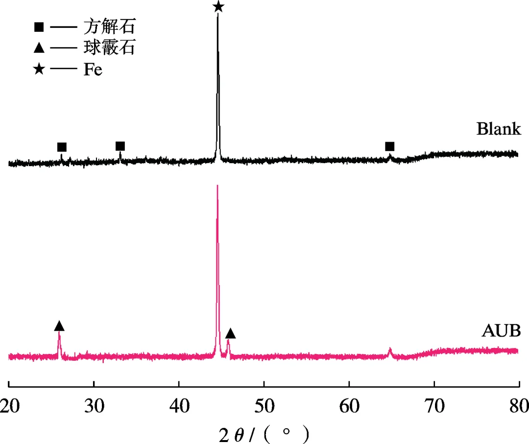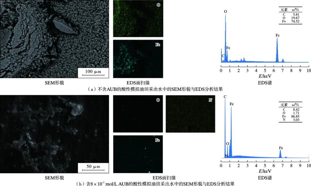 Q235钢在不含或含8×10-3 mol/L AUB的酸性模拟油田采出水中的SEM形貌与EDS分析结果
