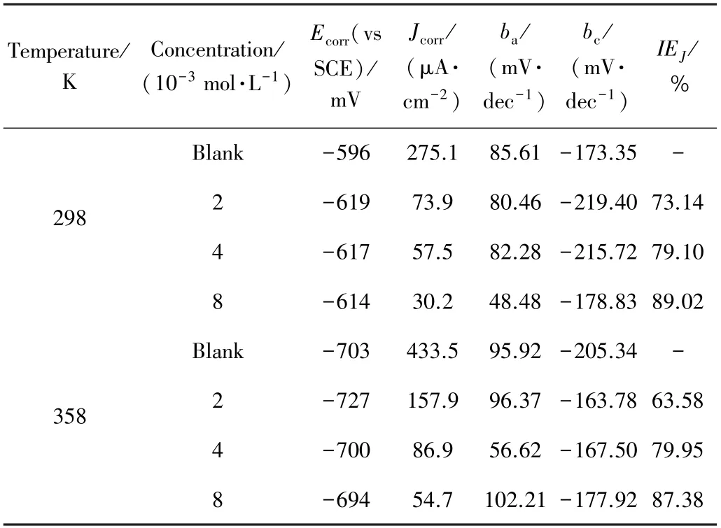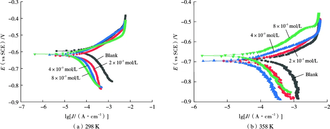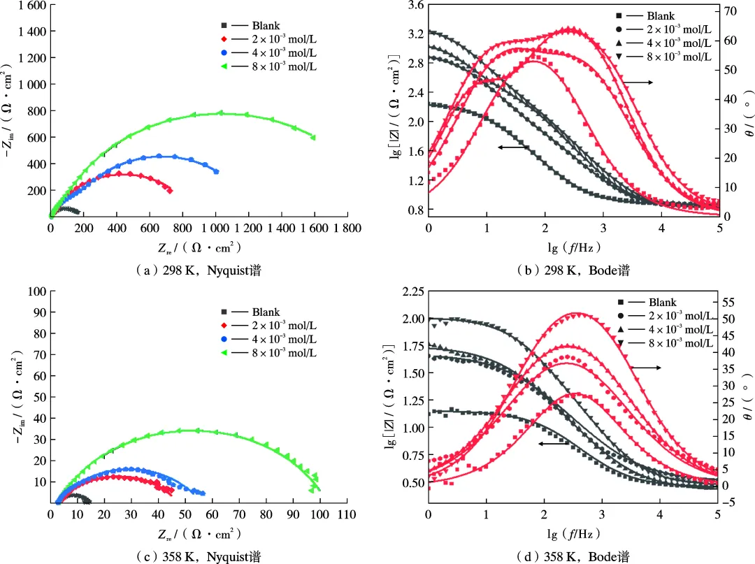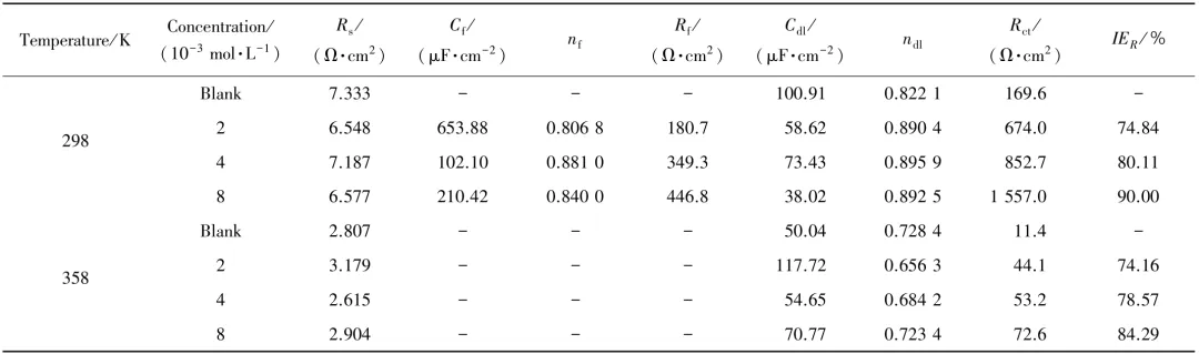 在298 K和358 K下Q235钢在酸性模拟油田采出水中的Nyquist谱和Bode谱 等效电路图