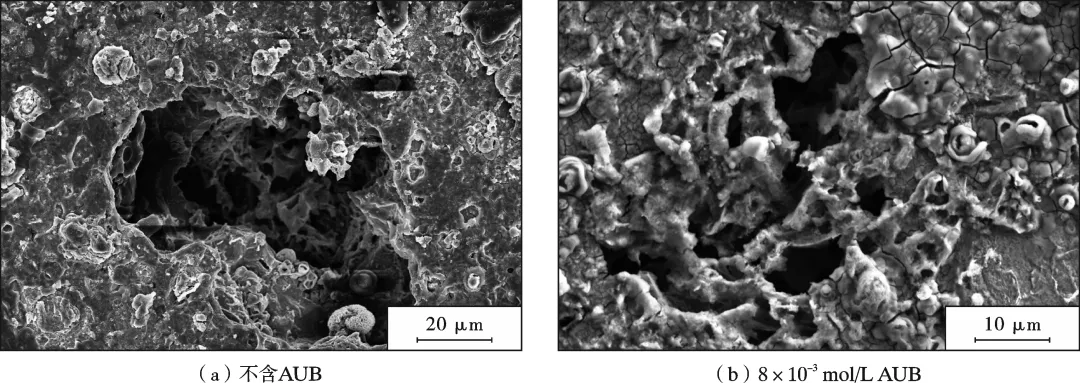 Q235钢在不含或含8×10-3 mol/L AUB的含SRB的酸性模拟油田采出水中的SEM形貌