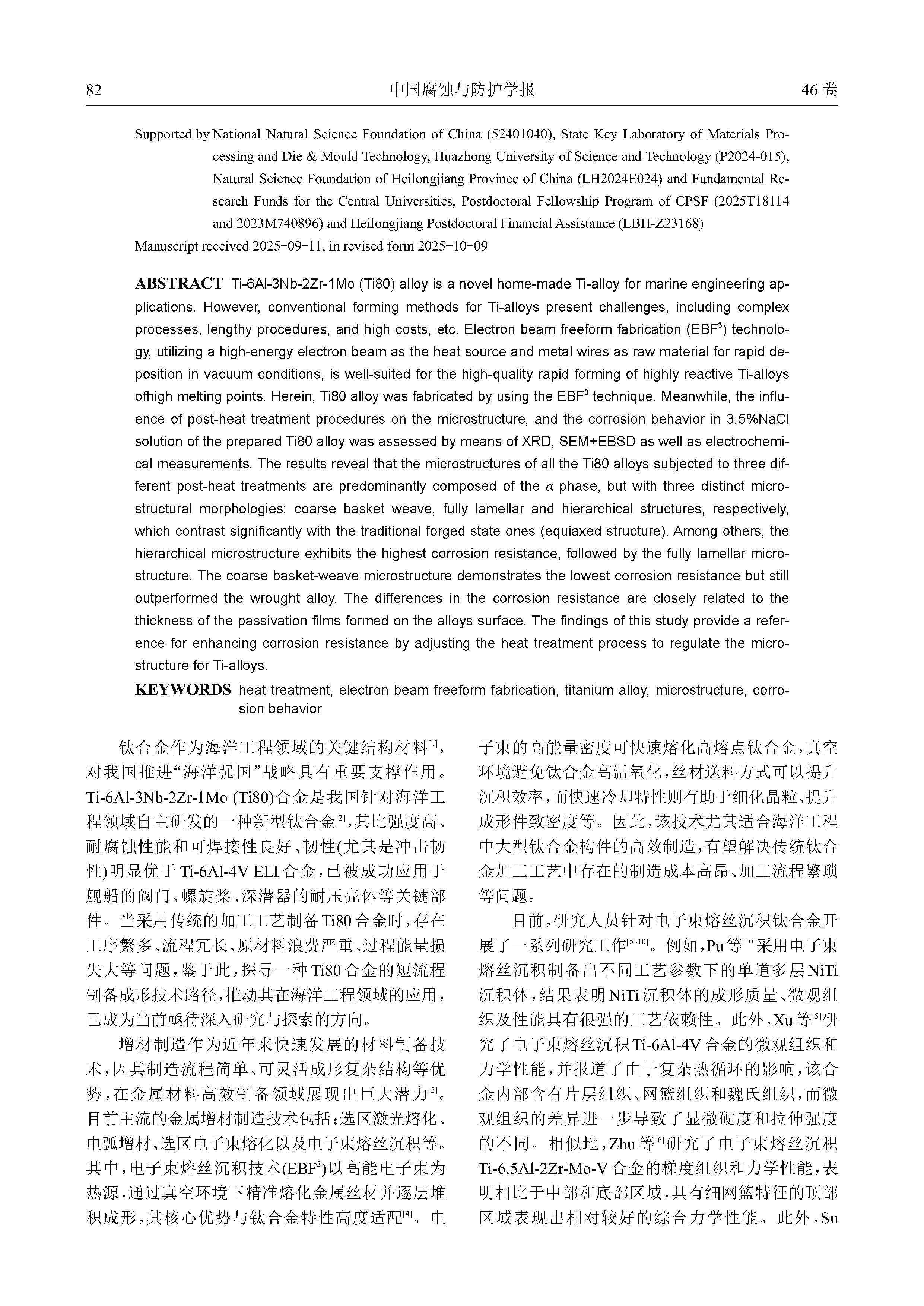 热处理工艺对电子束熔丝沉积Ti-6Al-3Nb-2Zr1Mo合金微观组织与腐蚀行为的影响