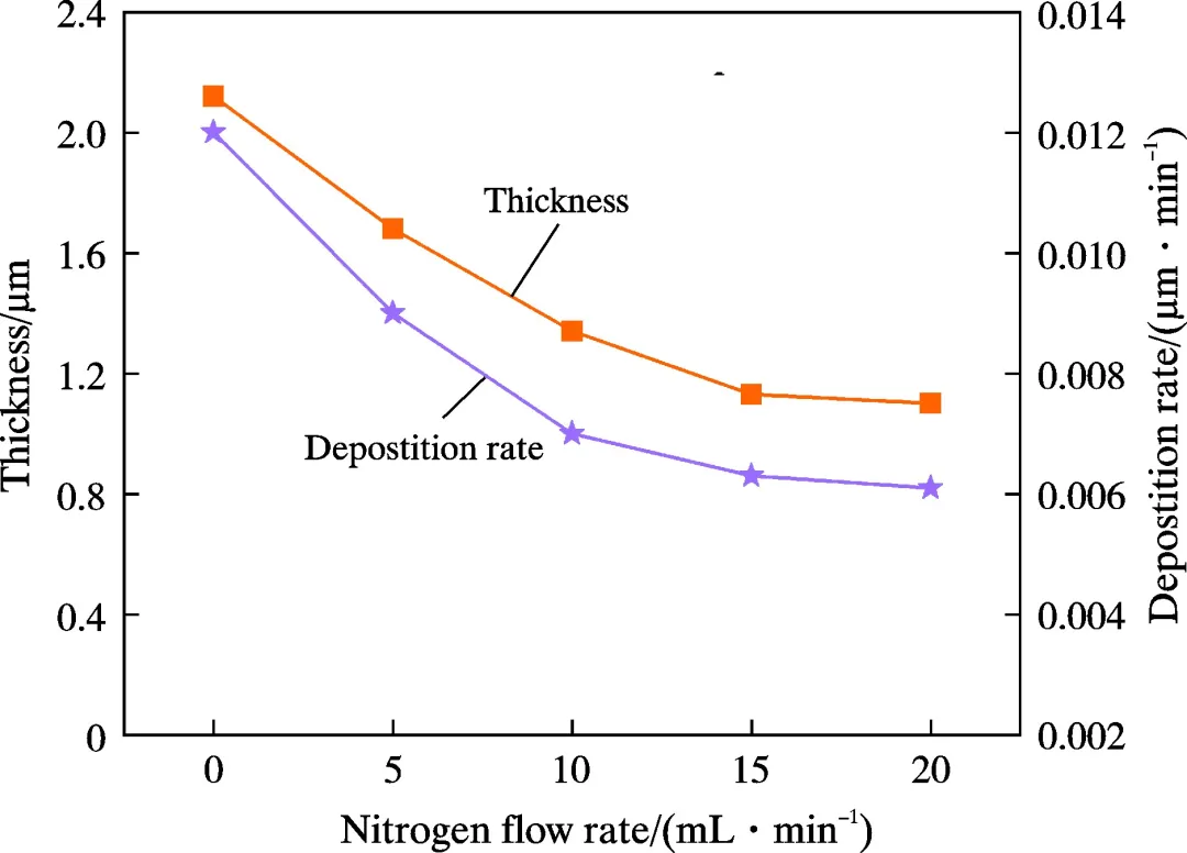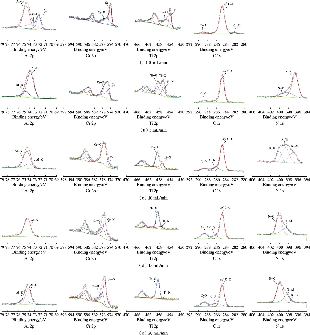 核心观点 采用脉冲直流磁控溅射与射频磁控溅射复合技术,通过调控不同N2流量(0、5、10、15、20 mL/min)制备出5种AlCrTiCN涂层。