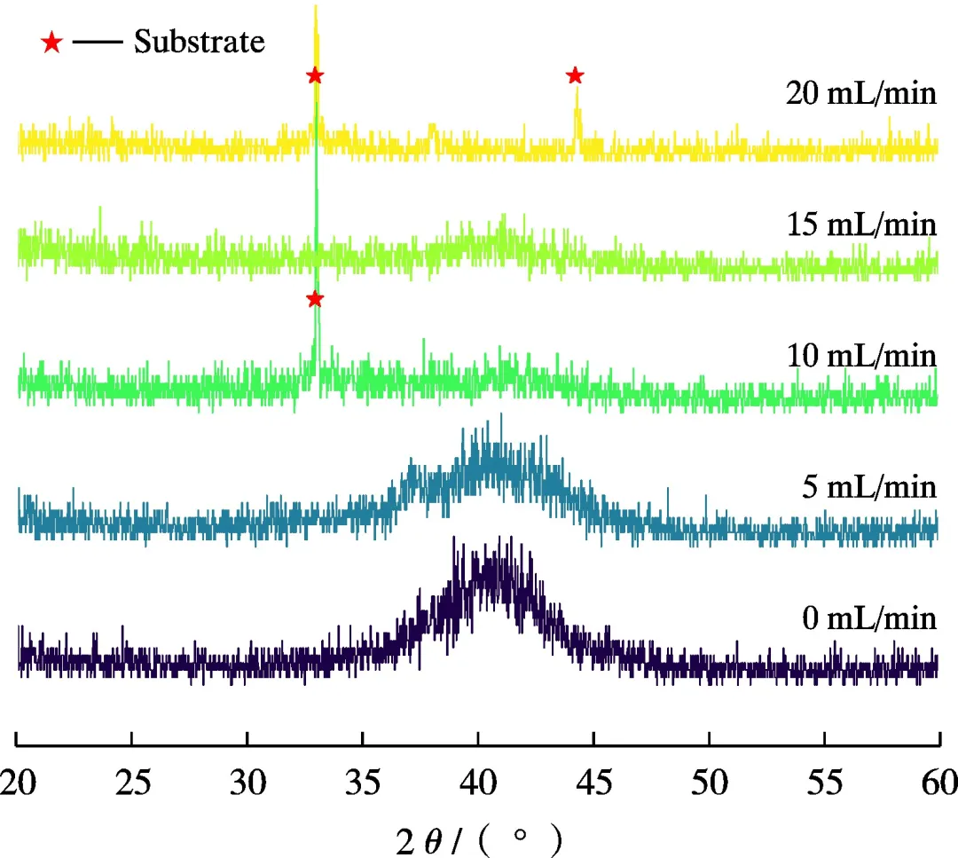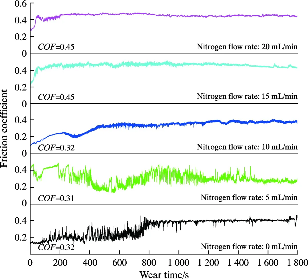Highlight 1 在N2流量较低时,涂层以低结晶度的纳米复合结构为主,涂层中主要相结构为非晶C相和纯金属相及其碳化物相,表面质量较差,表面缺陷较多, 随着N2流量的增加,涂层逐渐向非晶结构转变,涂层表面质量显著改善。 2 AlCrTiCN涂层的力学性能与涂层中金属元素与非金属元素含量比值密切相关,且表现出明显的区域性。在N2流量为10 mL/min时,涂层硬度和弹性模量分别达到最大值23.1 GPa和622.3 GPa, 主要归因于涂层中氮化物相的增加及固溶强化效应。随着N2流量继续增大,涂层中非晶C相的增多使得涂层硬度下降但韧性增强。涂层结合力随着N2流量的增加逐步提升,在20 mL/min时达到最大值30.8 N。 3 涂层的耐磨性能随N2流量的变化表现出显著差异。N2流量为10 mL/min时,由于其优异的力学性能,涂层拥有最佳耐磨性能,达到最低磨损率为5.7×10-6mm3/(N·m)。在N2流量为0、15、20 mL/min下制备的涂层在磨损试验后均失效而暴露出基体。在N2流量为0 mL/min时,涂层在800 s时发生失效,而在N2流量为15 mL/min和20 mL/min时制备涂层虽然硬度较低,但摩擦系数曲线表明其磨损过程平稳,在磨损过程临近结束时失效。