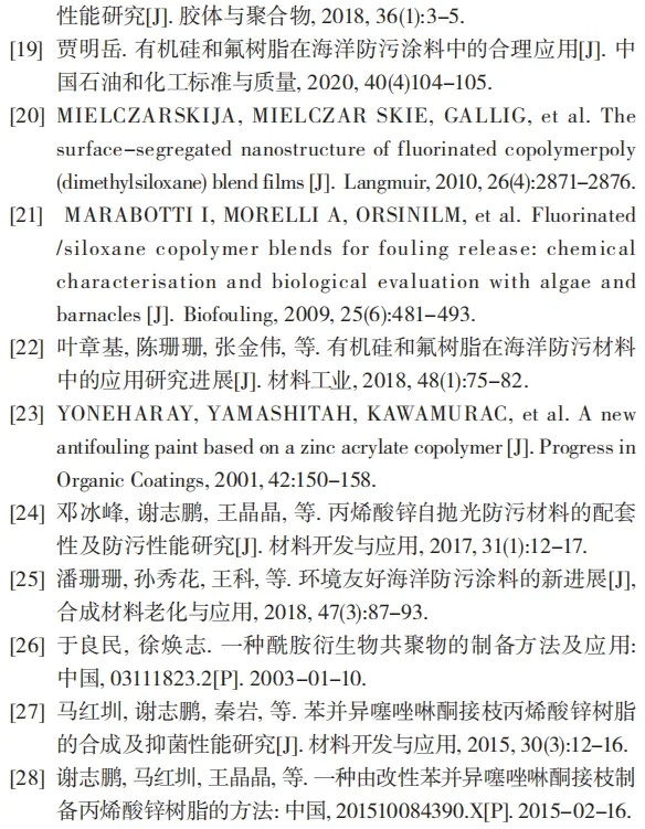 为了改变复配防污剂导致的涂层分布不均和防污剂团聚现象,研究人员考虑将防污剂接枝到树脂上,就可以通过化学方法“水解和扩散”释放防污剂,如此有利于提高防污剂的使用率,避免局部防污剂爆释现象。于良民等[26]制备了一类接枝的功能性丙烯酸锌树脂,浅水挂板试验表明,丙烯酸锌树脂具有良好的物理性能和防污性能。马红圳、谢志鹏等[27-28]通过对苯并异噻唑啉酮进行改性得到羧基,然后将含羧基的苯并异噻唑啉酮接枝到丙烯酸树脂上得到改性的丙烯酸锌树脂,使其侧链具有防污效果。结果表明,苯并异噻唑啉酮接枝丙烯酸锌树脂具有良好的防污性能。由于技术原因,大多数含接枝防污剂的防污材料还处于研究阶段,在实际应用中存在一些困难:由于接枝的防污剂大多需要提前改性,因此往往导致生产工艺复杂和防污剂防污性能的下降,并且在一定程度上提高了生产成本。因此,如何保证防污剂的性能,简化生产过程是未来研究的重点。