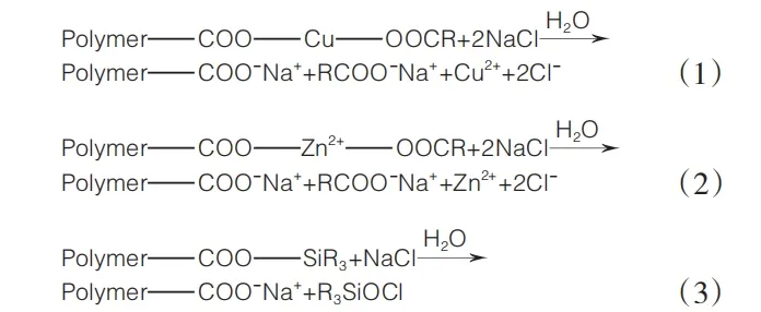 现有的自抛光防污材料是在有机锡自抛光的基础上变化改进而得,比有机锡自抛光防污材料更加绿色环保,适应各国绿色环保的政策要求。是目前海洋防污材料的一大研究方向。研究人员通过模仿聚丙烯酸锡酯的结构,在其基础上进一步改进,采用铜、锌及硅等[23-25]元素来代替锡元素,研制出了侧链水解型的聚丙烯酸铜、聚丙烯酸锌和聚丙烯酸硅烷酯树脂,制备出含有机锡自抛光防污材料性能的新型自抛光防污材料。由于有机锡被替换后的自抛光防污材料防污性能下降,所以需添加Cu2O或辅助高效的有机防污剂,才能保证防污的有效性和广谱性。该类自抛光防污材料水解机理见式(1)~式(3),侧基在海水中不断发生离子交换,主链则可在海水的冲刷下脱落,从而达到自抛光效果。