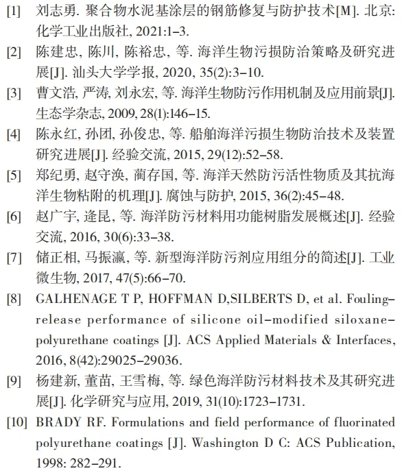 在海洋严酷环境下,氯盐侵蚀、冲击侵蚀、污损生物侵蚀时刻困扰着人们,如何有效解决这些问题成为一项重要的议题[1]。海洋生物污损是指附着于海工结构上的海洋生物对构件造成不利影响[2]。造成海洋污损的生物包括动物、植物以及微生物,其中起主要作用的有藤壶、贻贝、牡蛎、海藻和其他海洋细菌等,其对环境的危害主要包括:增加了船舶的航行阻力,增大了船舶在海上航行的经济负担;同时,污损的生物会随着轮船移动导致生物入侵的发生;随水流进入用水管道进而附着堵塞用水管道;产生的生物酸,加速了对金属的腐蚀,降低了金属的使用寿命周期[3]。因此,防治生物污损是各国共同关注的海洋环境问题。