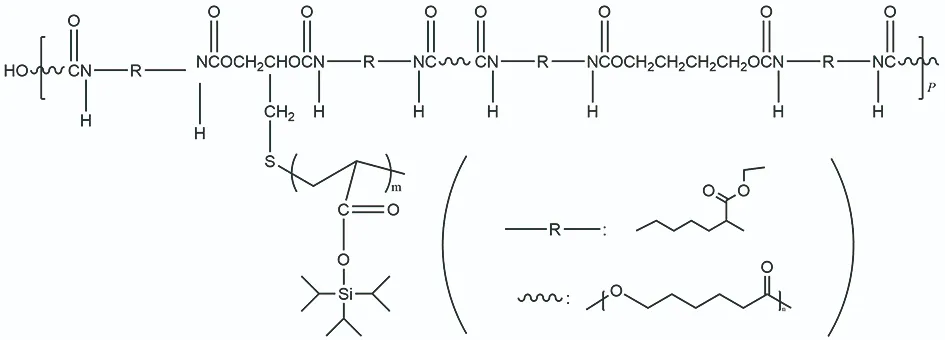 传统自抛光防污材料的主链是不可降解的,在侧链水解之后涂层表面残留有主链骨架,这不仅阻碍了防污剂的释放,而且由于其不易在海水中降解,对环境也有一定的危害。叶章基、艾孝青等[29-32]制备了一种新型自抛光防污材料,主链降解-侧链水解聚氨酯(如图1所示)和主链降解-侧链水解聚丙烯酸硅烷酯(如图2所示),可以使得侧链被水解时,主链被降解。浅海挂板试验证明,其防污性能优异。