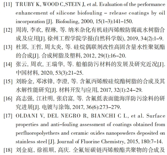由于有机硅和有机氟材料各存在其性能优缺点,因此科学家们对两者进行复合优化,以硅氧链为主链,在侧链中引入-CF3基团,制备了硅-氟树脂防污材料。线型聚硅氧烷保持了整个大分子的高弹性并且-CF3基团使得材料表面具有极低的表面能,使得硅-氟树脂防污材料能兼具有机硅和有机氟防污材料性能的优点。除了有机硅和氟的共聚之外,将有机硅与惰性低相对分子质量有机氟化合物物理共混[20-21]或是将具有反应活性的有机氟化合物作为交联剂与有机硅进行复合[22],均能使得形成的涂层具有更光滑的表面,进一步提高其防污性能。目前,低表面能防污材料仍存在基体的附着力差、施工工艺复杂、使用寿命较短、防污广谱性能差等实际应用问题。但是与传统防污材料相比,低表面能防污材料污染物排放量少,环保效益好,所以低表面能防污材料仍是一大发展趋势。