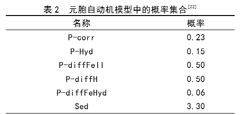金属材料的腐蚀对国民经济造成了非常严重的损失。据统计,我国每年因腐蚀问题造成的直接财产损失约为2万亿元人民币,约占每年国内生产总值的3%~5%,因此有必要对腐蚀现象进行全面且深入的研究。一般来说,研究人员多采用自然条件原位腐蚀试验方或者试验室加速腐蚀试验法对腐蚀现象进行评估,随着计算机技术的快速发展,数值模拟分析技术也越来越得到广泛关注。相对于试验方法,数值模拟分析具有运算周期短、可重复性强等优点,逐渐在腐蚀损伤表征、腐蚀损伤评估等方面发挥着重要作用,为腐蚀防护提供了有效的技术支持和数据支撑。根据计算原理,对于腐蚀领域的数值模拟分析主要可分为第一性原理计算、数据预测分析和数值建模计算3个方向。 第一性原理计算主要利用薛定谔方程,在晶体尺度上计算环境介质与金属晶体之间的反应。此方法利用量子力学基本理论,能够在原子的尺度量级上研究金属的微观腐蚀机理,但需要超高算力的计算硬件支撑和较精确的实验手段加以佐证,数值模拟周期较长。数据预测分析主要整理金属腐蚀数据,结合机器学习等算法,挖掘金属材料的腐蚀规律。此类方法能够较为直接地预测腐蚀损伤的表征参数变化情况,但无法重现腐蚀介质相互作用过程,对于深入理解腐蚀机理有局限性。数值建模计算主要通过数值模拟计算求解腐蚀过程中的电化学反应,构建扩散方程等,模拟真实的腐蚀动力学过程。元胞自动机模型方法属于数值建模计算中较为广泛应用的腐蚀仿真计算方法,由于其能够直观反映腐蚀电化学反应过程,结合定义的网格状态、演化规则等要素,能够较为精确地模拟腐蚀动力学过程,并对腐蚀机理进行相似复现,受到越来越多腐蚀领域的研究人员的关注。 1 元胞自动机发展历程 20世纪40年代,John von Neumann第一次设计出元胞自动机模型,用于模拟细胞自我复制过程。元胞自动机(Cellular Automata,CA)是一种数值模拟模型的总称,也是一种演化流程框架,此模型通过将实际系统进行元素离散化处理,形成不同状态的元胞,定义域内的元胞会根据演化规则相互作用。Ulam首次定义了“有限元胞自动机”的相关概念,进一步将这一模型进行优化。1970年,Conway运用元胞自动机相关运行机制,设计了名为“生命游戏”计算机游戏程序,通过一定的演化规则模拟简单生命体的成长轨迹,这一游戏程序迅速引起大众对元胞自动机的关注。1983年,Stephen Wolfram发表了关于元胞自动机相关理论模型和实际模拟应用的系统性专著,强调了元胞自动机的建模优势并展望了应用前景。 元胞自动机模型的组成及其相互之间的关系如图1所示。其中,元胞状态、邻居和演化规则是此模型的3种关键组成,元胞状态是指元胞模拟的作用元素及其特性,周边元胞的集合即为元胞邻居,常用的元胞邻居模型有Von Neumann型和Moore型,元胞自动机依据演化规则进行运行。 图1 元胞自动机模型的组成 随着计算机科学的快速发展,元胞自动机的各种理论变体逐步建立,拓展出多种元胞自动机类型,如表1所示。其中应用较为广泛的是二维和三维元胞自动机。 2 元胞自动机分类 2.1 二维元胞自动机 二维元胞空间主要有3种形式,六边形拓扑结构、矩形拓扑结构、三角形拓扑结构,如图2a~c所示。一般来说,较多使用矩形拓扑结构进行腐蚀过程模拟。为了解决初始元胞迭代易产生奇异性问题,引入极角和极径,采用弧底梯形拓扑结构进行蚀坑模拟,如图2d所示。 海洋腐蚀环境中元胞自动机模型主要模拟金属材料在腐蚀溶液中的电化学反应过程。电化学反应方程式可以表示为: 式中:Me代表金属;Me(OH)n表示反应后生成的锈蚀产物。以合金钢材料为例,此过程忽略Fe2O3等非水合物形式的腐蚀产物。为简化模型,根据海洋腐蚀环境下的E-pH图,确定了5种稳定物质,分别为H2O、Fe、Fe2+、H+和Fe(OH)2,元胞代号分别为W、M、R、H、P。元胞自动机的二维空间模型各元胞排列如图3所示。该模型由二维矩形晶格单元组成。初始条件:定义域中的上半部分为腐蚀溶液,下半部分为金属基体,模型中间分布H+元胞单元。边界条件设置为周期性边界。 图2 二维元胞自动机模型拓扑结构划分 图3 二维元胞自动机空间模型各元胞排列 Neumann型邻居主要考虑上下左右方向对于中心单元的影响,而Moore型邻居在上述4个方向的基础上,还需要考虑斜方向单元对于中心单元的影响,如图4所示。 图4 二维元胞自动机邻居类型 海洋腐蚀环境下的二维元胞自动机模型的演化规则一般分为2个模块,分别是腐蚀演化规则模块和元胞扩散规则模块,任意元胞在给定时刻只能展现一种状态。根据电化学反应原理,制定元胞自动机的腐蚀演化规则,如图5所示。 图5 二维元胞自动机腐蚀演化规则 点蚀坑成长受到扩散控制,元胞自动机模型中需要考虑扩散规则的电化学物质分别为Fe2+[P-diffFeII],H+[P-diffH]和Fe(OH)2[P-diffFeHyd],每种电化学物质有相应的扩散概率,如表2所示。上述物质中,Fe(OH)2因为不溶于腐蚀溶液,假设其在重力方向下移的概率大于其他方向移动的概率,将[P-diffFeHyd]引入沉降因子(Sed),实现其扩散的方向控制。 利用元胞自动机模拟合金钢材料均匀腐蚀所得到的纵截面二维表面形貌如图6所示。随着迭代步数增加,金属离子不断溶解,金属表面随机出现无规则的点蚀坑。当步数迭代至2000时,邻近蚀坑有的会发生连通,形成尺度更大的蚀坑