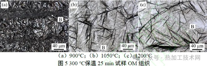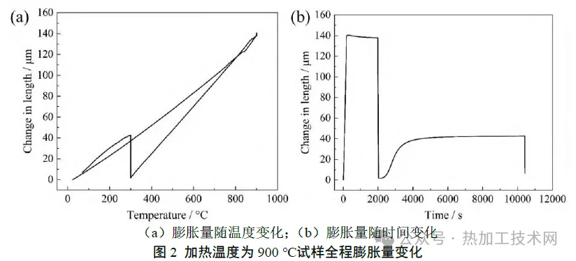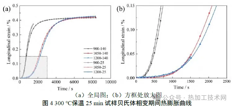 01|试验方案 试验钢为一种高碳合金钢,其化学成分( 质量分数,% ) 为Fe-0.97C-1.62Si-0.33Mn-0.35Mo-1.53Cr-0.98Co-1.14Al 。添加较多硅元素[w(Si)=1.62%]是为了抑制碳化物从奥氏体中析出,添加钴元素可以加速贝氏体相变,铝元素既可以抑制碳化物析出,也可以加速贝氏体相变。试验钢经常规冶炼和轧制后,得到厚度为15mm的热轧板。为了研究贝氏体相变行为,采用DIL 805L 淬火膨胀仪模拟等温贝氏体相变工艺,如图1所示。热膨胀试验的试样从热轧板上切取,尺寸为ɸ4mm×10mm。将试样加热至900、950、1000、1050、1100、1200℃,保温30min,随后以15℃/s 冷却速率冷却至300℃,保温140 min,最后淬火至室温。另外,对于加热温度为900、1050、1200 ℃的试样,额外进行300 ℃保温25 min 并淬火,以及加热后直接淬火[图1 (b)]。所有试样的编号和对应工艺见表1。 热膨胀试验后,对试样进行显微组织检测。采用光学显微镜(optical microscope,OM)和扫描电子显微镜(scanning electron microscope,SEM)观察试样组织形貌。制备碳复型试样,随后采用透射电子显微镜(transmission electron microscope,TEM)观察可能存在的析出相,并进行能谱(energy dispersivespectroscopy,EDS)检测。采用场发射电子探针(electron probe microanalyzer,EPMA)检测试样微区元素分布。此外,采用高温共聚焦显微镜(high-temperature laser scanning confocal microscope,HT-LSCM)观察试样在900℃和1050℃保温时的奥氏体晶粒。