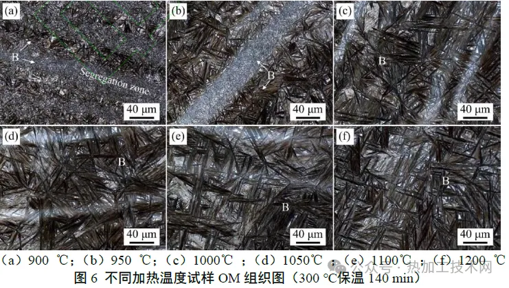02|试验结果 1 贝氏体相变动力学 B900-140 热模拟试样全程热膨胀曲线如图2所示。 由图2(a)可知,300 ℃之前的冷却过程中热膨胀随温度呈线性变化,即未发生相变。在300℃保温期间,发生贝氏体相变,膨胀量增大。由图2(b)可知,300℃保温后期膨胀量基本不变,说明贝氏体相变达到了最大量。 根据300℃保温期间的热膨胀量,计算贝氏体相变相对动力学,再结合最大转变量获得实际相变动力学,计算公式见式(1),计算结果如图3所示。贝氏体最大转变量根据光学显微镜组织统计得到。 式中:ΔL为300℃保温期间膨胀量实时变化值,μm;ΔLmax为300℃保温期间膨胀量,最大变化值,μm; f为贝氏体实时相含量;fmax为贝氏体最大转变量。 不同加热温度试样贝氏体相变动力学如图3所示。 加热温度为900℃时,贝氏体相变动力学明显快于其他试样,完成5%和50%相变所需时间分别为409s和1104s。加热温度升高至950 ℃后,相变动力学急剧减慢,完成5%和50%相变所需时间分别为1138s 和2374s,延长至900℃的2倍以上。进一步将加热温度升高至1000℃后,相变动力学继续减慢,但减慢趋势明显减缓,完成5%和50%相变所需时间分别为1254s 和2575s。由此可见,随着加热温度升高,贝氏体相变动力学呈减慢趋势,但存在一个临界温度(950℃左右),在该温度之前,相变动力学随温度升高急剧减慢,而该温度之后,相变动力学变化缓慢。 为了进一步验证加热温度对贝氏体相变动力学的影响,选择加热温度为900、1050、1200℃试样进行短时间等温(25min)+淬火实验。贝氏体相变期间膨胀量变化率(ΔL/L0,L0为试样原始长度)如图4 所示。可以看出,在相同加热温度下,短时间保温(25min)和长时间保温 (140min)试样膨胀曲线基本重合,表明试验重复性较好。B900-25、B1050-25、B1200-25试样室温组织如图5所示。由于300℃保温时间较短,贝氏体相变不充分,剩余奥氏体部分转变为马氏体,所以室温组织主要为贝氏体和马氏体,可能存在少量残余奥氏体。经统计可知,B900-25、B1050-25、B1200-25 试样贝氏体相体积分数分别为(78.7±2.0)%、(12±1)%、(11±2)%。上述结果证实了试验钢贝氏体相变速率在较低加热温度下更快,但超过临界温度后,相变动力学变化明显减缓。 2 显微组织 长时间相变试样(140min)室温OM和SEM组织如图6和图7所示。所有试样室温组织主要为贝氏体(B)和残余奥氏体(RA),可能存在少量马氏体(M)。SEM 图像清晰显示出贝氏体铁素体(BF)及相邻BF 之间分布的薄膜状RA。加热温度为900 ℃时[图6(a)],组织中存在明显偏析带,形成了2种形貌和尺寸截然不同的贝氏体区域。结合图6(a)和图7(a)可知,偏析区域的贝氏体板条长度明显较短,厚度较粗。加热温度增加至950℃后,偏析带数量减少,非偏析区域贝氏体束长度增大。加热温度进一步升高至1050℃后,观察不到明显偏析带,贝氏体尺寸分布较为均匀。加热温度为1050~1200℃时,贝氏体形貌和尺寸没有明显变化。此外,对每个试样选取多张OM 组织图统计贝氏体含量,发现加热温度为900、950、1000、1050、1100、1200℃试样贝氏体体积分数分别为(75±2)%、(79±5)%、(82±2)%、(81±3)%、(80±3)%、(83±2)%。随着加热温度升高,贝氏体含量先升高,后变化不大。