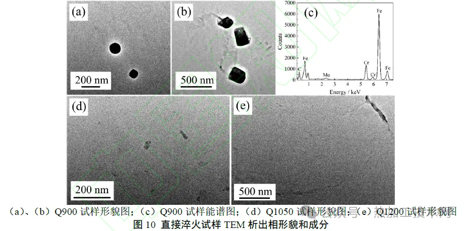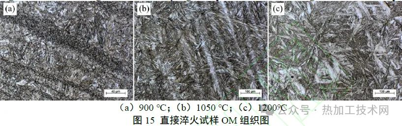 04|结语 1) 随着加热温度升高,贝氏体相变动力学减慢,主要原因是本试验钢中存在微米级和亚微米级富铬、钼碳化物,虽然本试验加热温度均高于其完全回溶温度,但大尺寸第二相的回溶在动力学上受到显著抑制,加热温度较低时,难以完全回溶。而加热温度较高时,析出颗粒回溶进入基体,增大了贝氏体相变激活能,从而减慢了相变动力学。 2)存在一个临界温度 (约为950℃),低于该温度时,贝氏体相变动力学随加热温度升高而急剧减慢。例如,温度由900℃增加至950℃相变,完成5%相变所需时间延长至2倍以上。然而,高于该临界温度时,相变动力学变化趋势明显变缓。 3)加热温度对原始奥氏体晶粒尺寸和室温组织产生显著影响。加热温度较低时,由于合金元素偏析和第二相的带状分布,原始奥氏体中出现了带状分布的细晶区和粗晶区。细晶奥氏体区中形成的贝氏体长度较短,厚度较大。当加热温度较高时,原始奥氏体晶粒和室温贝氏体晶粒尺寸分布较为均匀。