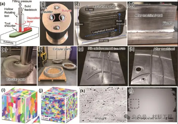 增材搅拌摩擦沉积(additive friction stir deposition, AFSD)具有沉积温度低、增材质量好、制造效率高等特点,在航空航天制造领域具有广阔的应用前景。本文详细介绍了AFSD技术,深入剖析了AFSD对三类析出强化型铝合金组织和性能的影响规律及机理,并指出了制约高强铝合金构件AFSD制造的关键问题。AFSD在固相下进行沉积,克服了基于激光和电弧沉积的气孔和热裂纹缺陷。然而,在AFSD过程中,由于沉积金属的冷却速度较慢,敏感温度区间的停留时间较长,在增材时后续沉积层对前一层,甚至前几层均有热作用。因此,沉积样品中部与底部的晶内强化相粗大,使得沉积层中下部的强度急剧下降。沉积层顶部不受二次或多次热循环的影响,析出相分布均匀,力学性能较好,但仍低于基体材料。时效处理可使AFSD过程固溶的部分元素再次析出,性能轻微提升,但始终无法达到固溶+时效(T6)的水平。虽然沉积态经过T6处理后可再次形成均匀细小的强化相,使其强度重新达到峰值,但在固溶的同时,沉积材料将发生晶粒的异常长大(abnormal grain growth,AGG)问题,因此,通常不建议对AFSD沉积金属进行固溶处理。为了实现高强度析出强化铝合金构件的AFSD制造,未来还需要在合金化设计、复合强化、工艺创新等方面开展进一步的研究工作。 研究背景 随着航空制造技术的迅猛发展,高端装备对铝合金构件的使役性能和制造工艺提出了越来越高的要求。AFSD增材制造技术使用固体棒材或粉末来进行大型部件快速沉积增材制造,通过结合三维数控机床规划路径可完成大构件的复杂沉积增材,所需工艺、设备及工作环境简单,相较激光/电弧增材铝合金不易产生气孔、裂纹、元素偏聚烧损等缺陷,且沉积效率较高,是航空铝合金构件成型的理想技术之一(图1)。然而,析出强化型铝合金中的析出相在AFSD增材制造过程中粗化规律复杂,对铝合金性能的影响显著,因此,掌握析出强化型铝合金的析出相在AFSD过程中的演化规律,形成析出相形态的控制方法,进而提升AFSD增材制造铝合金的性能仍是重要挑战。本文结合课题组在AFSD增材制造析出强化型铝合金方面的实践经验,总结了国内外在析出强化型铝合金固相增材制造的研究进展,并对未来发展方向进行展望。 图1 AFSD技术及其制造的零件应用 主要创新点 (1) 系统性揭示了AFSD技术对高强铝合金析出强化行为的影响机理。 明确指出AFSD特有的“热历史”问题(沉积温度高、冷却速度慢、后续沉积层对前序层的反复热循环)是导致析出强化相(如Al-Mg-Si系的β''相、Al-Cu系的θ'/S'相、Al-Zn-Mg-Cu系的η'相)发生粗化和溶解,从而造成沉积态构件强度下降的根本原因。阐明了沉积层力学性能(强度、硬度)沿沉积高度呈梯度分布的规律(顶部性能优于中底部),并将其归因于不同沉积区域所经历的热循环次数和峰值温度的差异。 (2) 评估了传统热处理路径在AFSD构件中的应用局限,并提出了新的研究方向。 指出虽然固溶+时效(T6)处理可使AFSD沉积态性能恢复至峰值,但会引发晶粒异常长大(AGG)问题,损害韧性,因此对于大型构件通常不具可行性。指出直接时效处理因沉积过程中固溶原子已大量消耗于粗大相,导致性能提升有限,无法达到传统锻件水平。基于此,提出未来研究的核心应致力于通过材料设计和工艺创新,实现AFSD构件在直接制造后或仅经低温时效后即可达到使用要求。 (3) 提出了实现高性能AFSD高强铝合金构件未来的关键发展路径。 材料设计创新方面,提出开发新型合金体系,如引入对热不敏感的稳定纳米级增强相(复合材料思路),或通过基体合金化设计以延缓粗化析出相的形成,为低温时效创造有利条件。工艺技术创新方面,提出在保证成型性的前提下,通过降低热输入、提高冷却速度(如采用辅助水冷技术)、开发大推力高速AFSD工艺等手段,从源头上抑制析出相的粗化,是提升沉积态性能的有效途径。 主要研究结果结论 国内外的研究已证实了AFSD技术的可行性及独特优势。首先,AFSD制造不涉及材料的熔化与凝固,因此在抑制气孔、裂纹、元素偏析等方面明显优于传统的激光或电弧增材制造技术;其次,它具有显著的成本优势,生产棒材的成本明显低于丝材或粉体;最后,AFSD技术对环境友好,避免了熔融增材过程中产生的光污染和粉尘污染。然而,AFSD的加工过程存在特殊的“热历史”问题,即后续沉积层对前层甚至前几层材料的热影响,这一问题无法通过后时效处理解决。一般AFSD制造后,固溶+时效处理方法会引起工件变形和内部晶粒异常长大。因此,如何利用AFSD技术,使增材制造的零件能够在直接制造后或在低温时效后达到可使用状态,这是未来发展高强铝合金大构件制造所面临的巨大挑战之一。 目前,AFSD技术在高强度铝合金材料的应用尚未普及,且缺乏适用于AFSD技术的高强铝合金材料以及相关制造工艺。高强铝合金的强韧化与析出相密切相关,因此,为实现高强度铝合金的AFSD制造,关键问题包括材料设计和工艺创新: (1)材料设计需引入新的析出强化方法,如稳定的纳米级增强相,形成复合材料。此外,可以通过基体的合金化设计,控制元素扩散,延长粗大析出相的形成时间和温度,以便在低温时效过程中形成纳米级析出强化相; (2)在工艺创新方面,需在保证成型性的前提下,降低热输入,提高冷却速度,以抑制析出相粗化。辅助冷却技术,如水冷,也可用于提高沉积金属的冷却速度,降低析