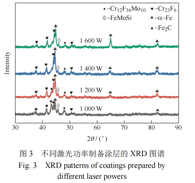 利用D8 ADVANCE X射线衍射测试仪对熔覆合金粉末和涂层表面进行分析。以FEI Quanta FEG 250扫描电子显微镜涂层进行微观组织观察。采用HV-1000型维氏硬度计测量试样的截面硬度。采用(G200,America)纳米压痕仪测量涂层的微观硬度和弹性模量。采用Rtec摩擦机与Modulab电化学磨蚀仪来检测涂层的磨损-腐蚀耦合损伤,以ZrO2球(φ=3 mm)为摩擦球进行摩擦试验。并且通过三电极体系在磨蚀测试过程中进行电化学检测,其中Pt电极为对电极(Counter electrode),Ag/AgCl电极为参比电极(Reference electrode),待测样品为工作电极(Working electrode),腐蚀液为3.5wt.%NaCl溶液。