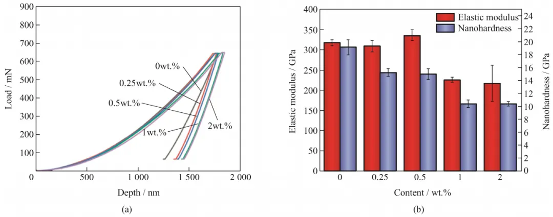 CNTs 的添加降低了涂层的硬度,且随着含量增加,涂层的硬度降低,CNTs 为 0.25wt.%涂层的显微硬度为 1 024.55 HV0.2,添加 0.5wt.%的CNTs 使涂层的弹性模量增加了约 17.9 GPa。