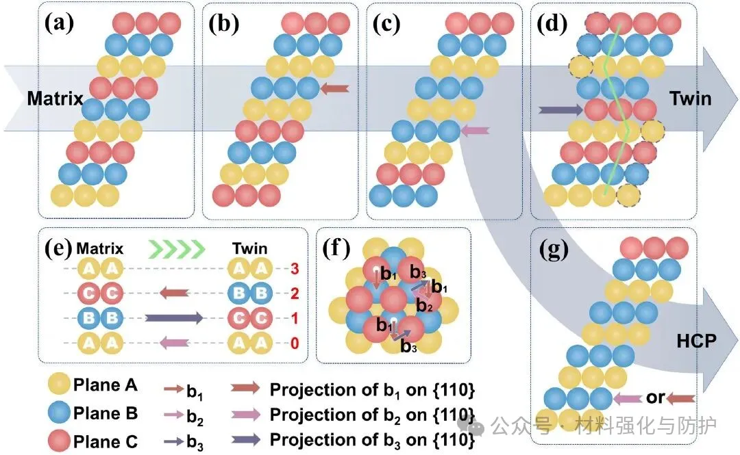 ④ 多层错相互作用诱发零应变孪晶与局部结构转变