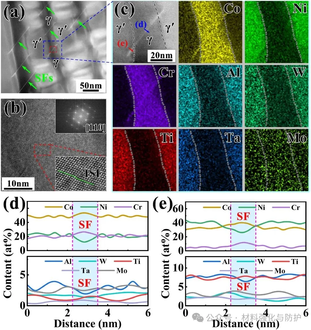 γ通道内的层错与孪晶界面处存在显著的成分重分布现象,Co与Cr元素在平面缺陷区域明显富集,而Ni与Al则表现出相对贫化趋势,同时W元素在层错-孪晶交汇区域出现局部偏聚,这种元素偏聚不仅进一步降低了局部层错能,促进层错的扩展与稳定,还通过溶质拖曳效应抑制位错的交叉滑移与攀移行为,从而在微观层面上稳定了γ通道内的缺陷网络结构。