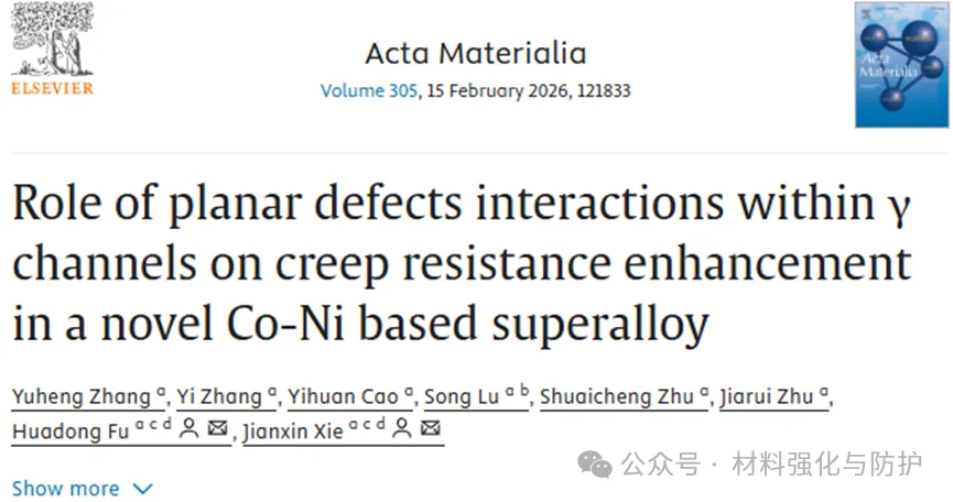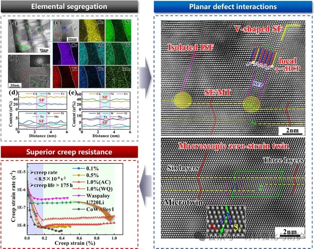 北京科技大学团队于2025年12月16日近期在《Acta Materialia》期刊上发表了题为“Role of planar defects interactions withinγchannels on creep resistance enhancement in a novel Co-Ni based superalloy”的研究论文,团队在γ通道内部直接观察到多类型平面缺陷的复杂交互行为,并提出通过晶体学缺陷工程(defect engineering)优化中温蠕变性能的全新设计思路。通讯作者为北京科技大学的付华栋教授和谢建新院士。