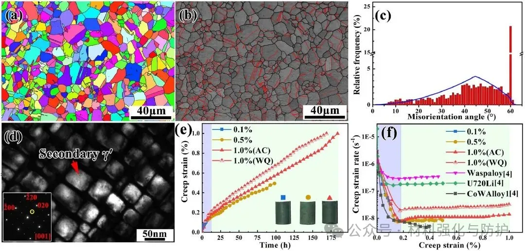 该合金形成了平均晶粒尺寸约为11.2μm的均匀细小γ/γ'双相结构,γ'析出相呈现典型的多尺度分布特征,其中晶内二级γ'占据主导地位,体积分数约为51%,为后续蠕变过程中位错活动提供了稳定而连续的强化骨架,在750℃、620MPa的中温高应力条件下,该合金表现出极低的最小蠕变速率(~8.5×10-9 s-1),显著优于传统变形高温合金。