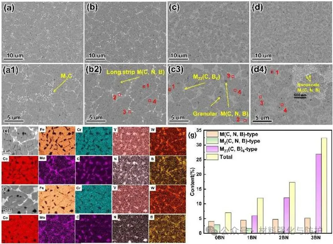 团队将合金成分为:2.03 wt.%C、4.23 wt.%Cr、6.48 wt.%Mo、6.52 wt.%W、6.25 wt.%V、4.45 wt.%Co的高速钢粉末颗粒与由纯度99.8%的纳米BN颗粒组成的BN粉末在200rpm的球磨机中混合4h,使纳米BN颗粒均匀地附着在球形HSS粉末表面,共设计了四种不同BN含量(0、1、2和3wt.%)的样品,分别命名为0BN、10BN、20BN和30BN。采用激光熔覆技术在普通碳钢(Q355)表面制备了HSS/BN复合涂层。针对制备完成的样品团队结合XRD与SEM/EDS分析相组成并表征显微组织与元素分布,通过显微硬度测试与干滑动磨损实验评估耐磨性能;以动电位极化曲线与电化学阻抗谱(EIS)系统表征样品的腐蚀行为,系统性的以结构-性能-机制的多尺度关联分析为核心,深入揭示第二相调控规律。
