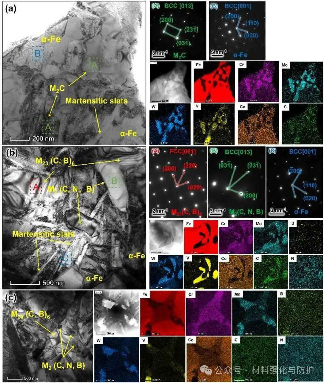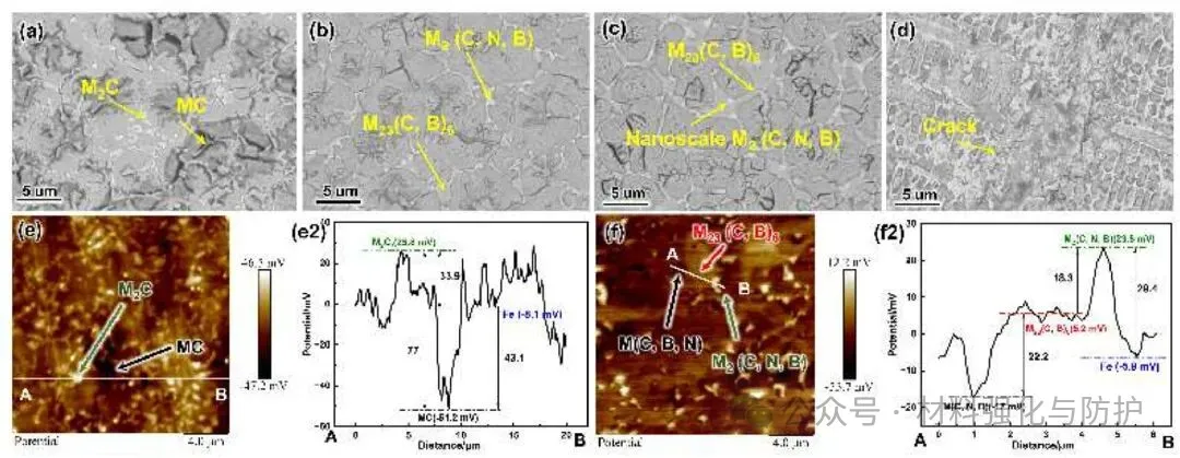 该研究从第二相类型与分布调控的角度,系统揭示了碳硼化物与碳氮化物在铁基涂层中的协同强化机制,这一成果为高服役环境下铁基涂层的成分设计与组织调控提供了清晰的材料学思路,对工程应用具有重要指导意义。