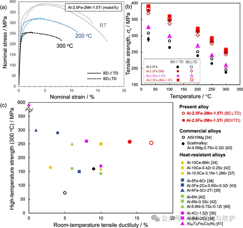 Al-Fe-Cu合金的室温抗拉强度超过350MPa,其主要依靠纳米析出相增强应变硬化。Al-Fe-Mn合金在300℃下屈服强度高于220MPa,具有优异的高温稳定性。另外,Al-Fe-Ti合金室温伸长率达15%,晶粒能够被细化至2.3μm,其力学性能各向同性被显著提升。