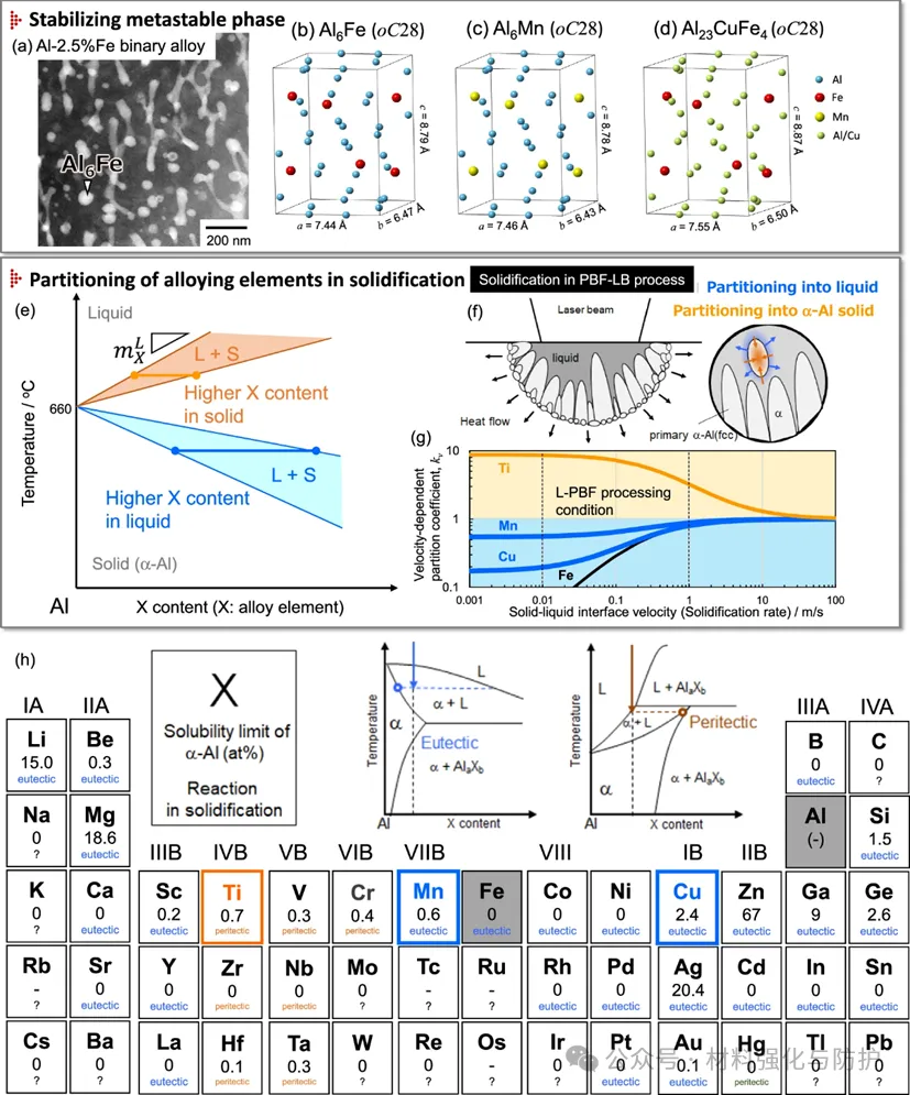 该研究提出“液相/固相选择性分配”设计思路,利用元素在凝固过程中的分配特性,让Cu、Mn共晶型元素优先进入液相稳定Al6Fe强化相,包晶型元素Ti进入固相α-Al基体实现固溶强化与晶粒细化。同时,该研究还将回收废料中常见的Fe和Mn等杂质,将它们转化为有益的强化组元,并通过PBF-LB快速凝固形成亚稳Al6Fe相,替代脆性Al13Fe4相,实现可回收和高性能。