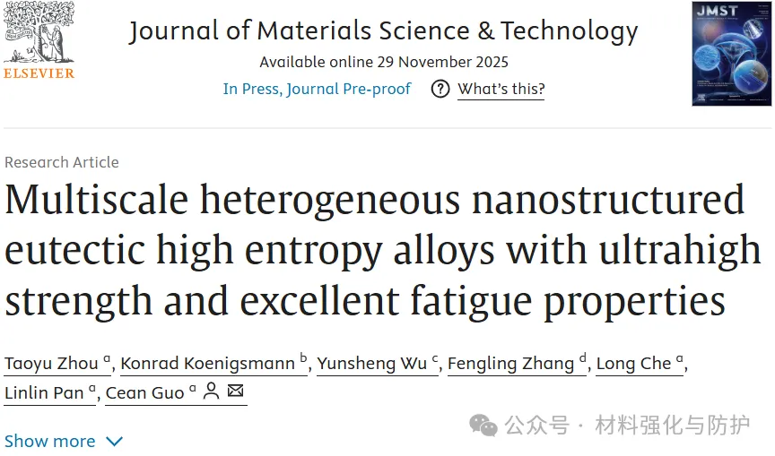 2025年11月,期刊《Journal of Materials Science & Technology》在线发表了一篇题为“Multiscale heterogeneous nanostructured eutectic high entropy alloys with ultrahigh strength and excellent fatigue properties”的研究论文,该论文提出了一种通过多尺度异质纳米结构调控显著提升共晶高熵合金综合力学性能的新策略,成功在单一材料体系内同步实现了强度显著提升与疲劳寿命大幅延长,论文的通讯作者为沈阳理工大学的郭策安教授。
